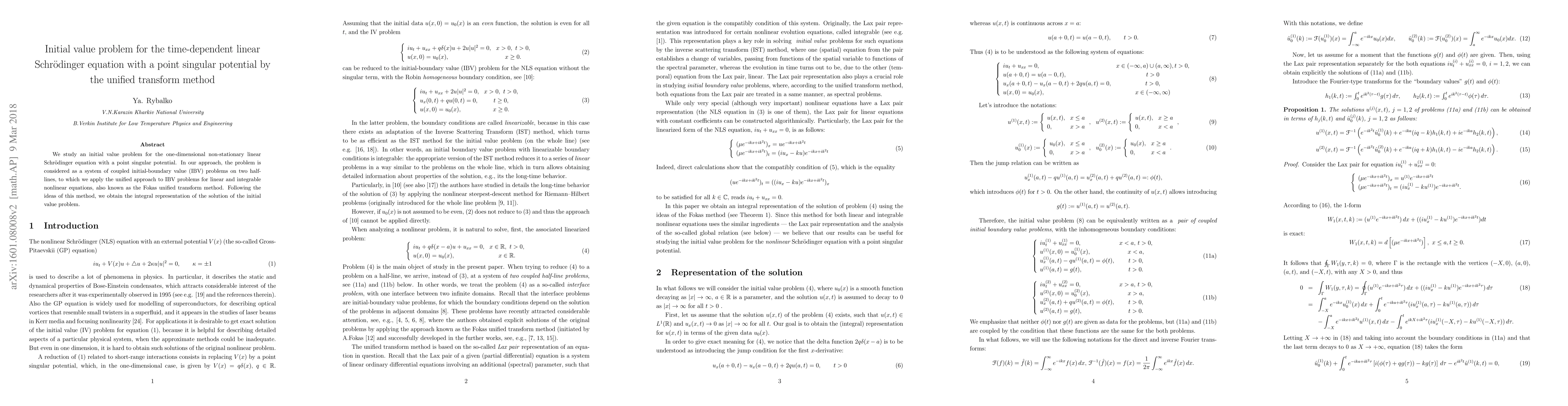 We study an initial value problem for the one-dimensional non-stationary linear Schr\"odinger equation with a point singular potential. In our approach, the problem is considered as a system of coupled initial-boundary value (IBV) problems on two half-lines, to which we apply the unified approach to IBV problems for linear and integrable nonlinear equations, also known as the Fokas unified transform method. Following the ideas of this method, we obtain the integral representation of the solution of the initial value problem. Since the unified approach is known as providing efficient solutions to both linear and nonlinear problems, the present paper can be viewed as a step in solving the initial value problem for the non-stationary {\em nonlinear} Schr\"odinger equation with a point singular potential.