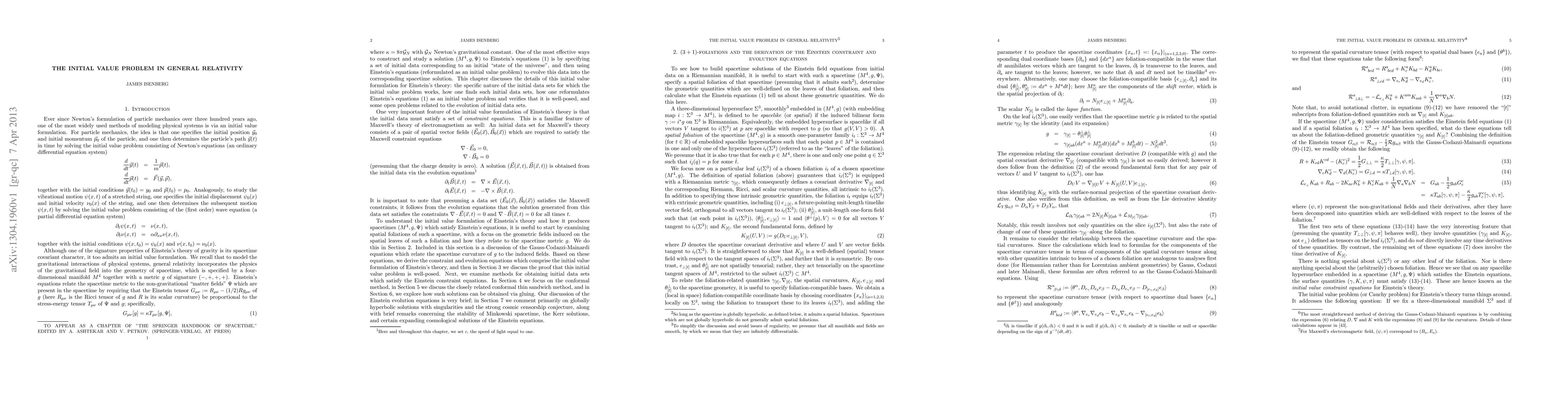 This paper reviews the initial value problem for Einstein's general relativity, explaining how to reformulate the theory in terms of 3+1 dimensional foliations and demonstrating the well-posedness of the problem. It also discusses methods for generating initial data sets and comments on the stability and long-term behavior of solutions.