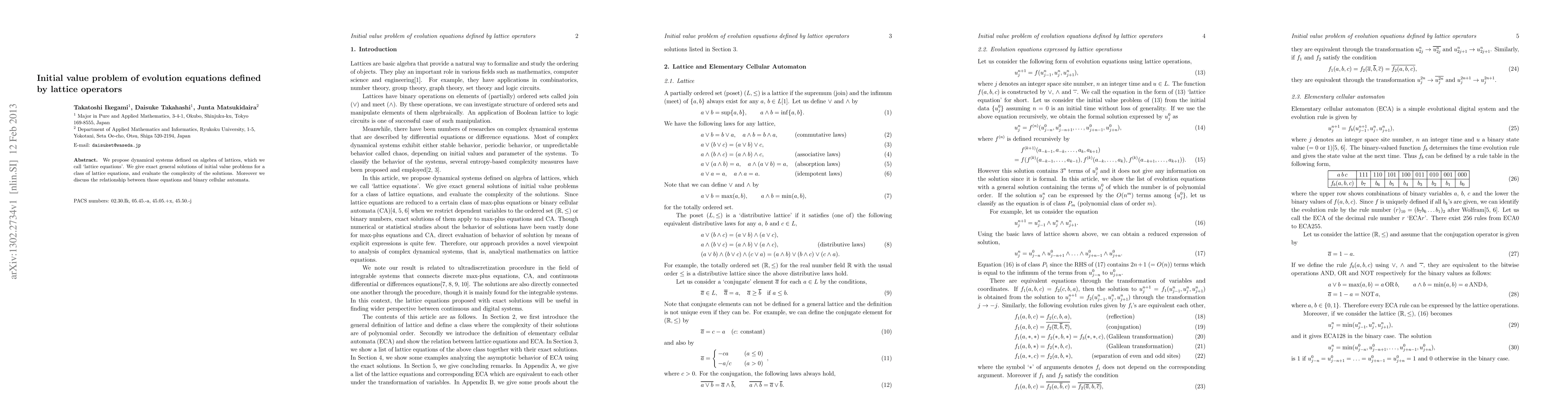 We propose dynamical systems defined on algebra of lattices, which we call `lattice equations'. We give exact general solutions of initial value problems for a class of lattice equations, and evaluate the complexity of the solutions. Moreover we discuss the relationship between those equations and binary cellular automata.