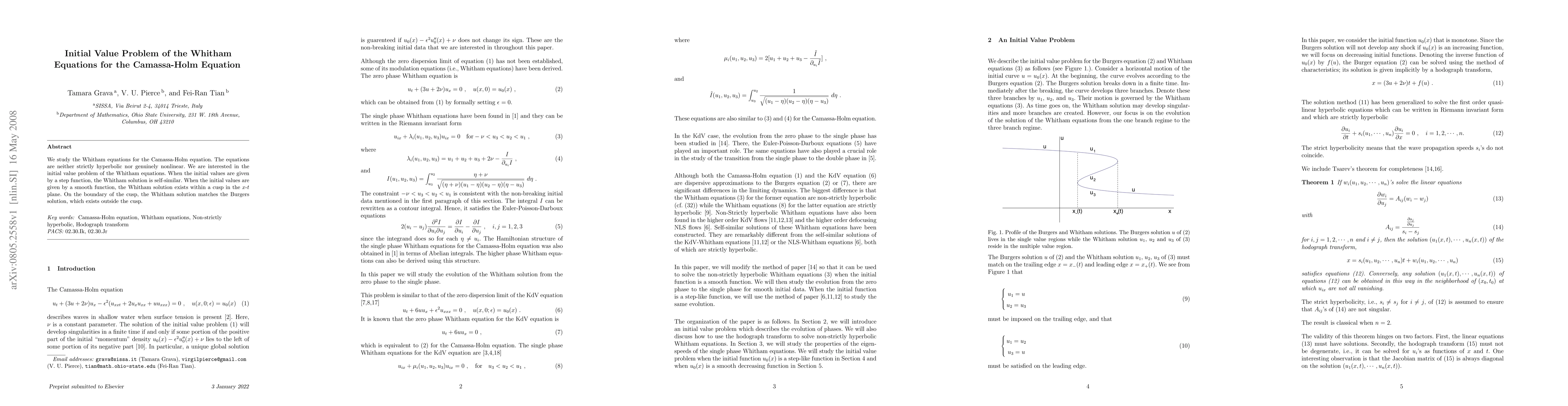 Summary: This study examines the Whitham equations associated with the Camassa-Holm equation, revealing that they are not strictly hyperbolic. The paper investigates the initial value problem, finding self-similar Whitham solutions for step function initial data and cusp-shaped solutions for smooth initial data, which transition to Burgers solutions outside the cusp.