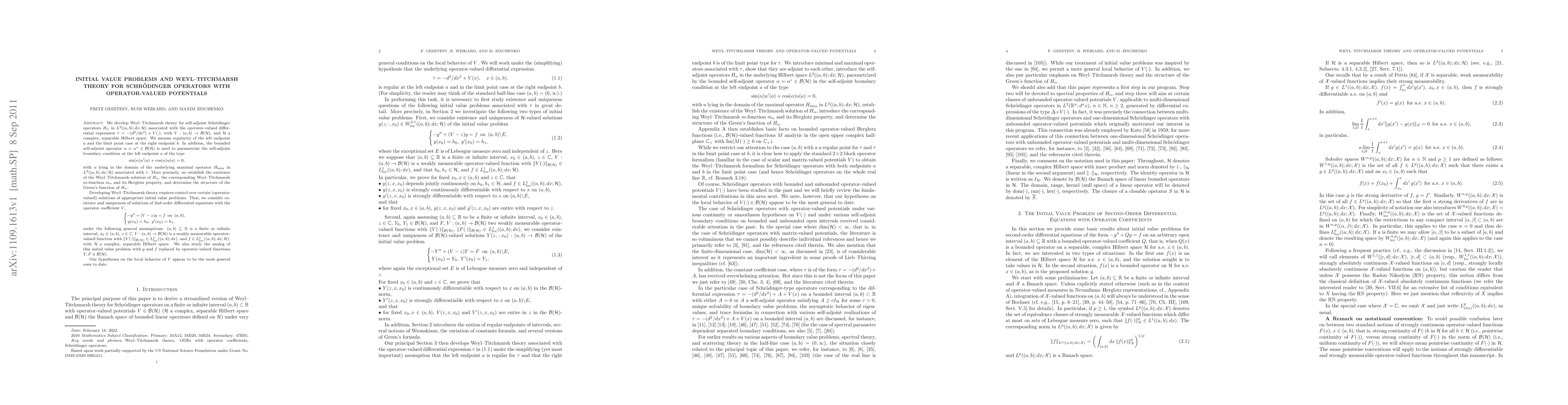 This paper develops Weyl-Titchmarsh theory for self-adjoint Schr"odinger operators with operator-valued potentials, establishing the existence of solutions to initial value problems and determining their structure.