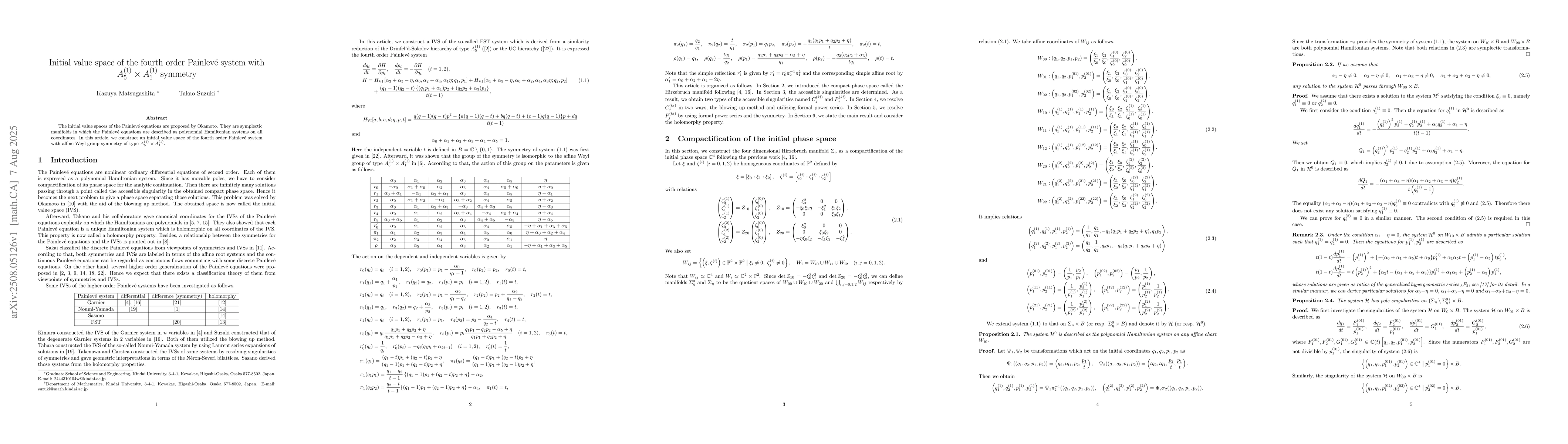 The initial value spaces of the Painlev\'{e} equations are proposed by Okamoto. They are symplectic manifolds in which the Painlev\'{e} equations are described as polynomial Hamiltonian systems on all coordinates. In this article, we construct an initial value space of the fourth order Painlev\'{e} system with affine Weyl group symmetry of type $A_5^{(1)}\times A_1^{(1)}$.