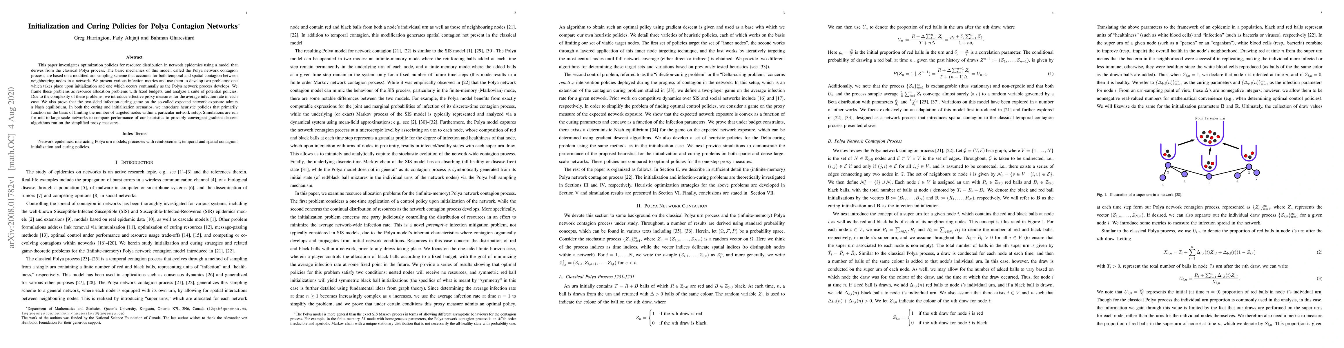 This paper investigates optimization policies for resource distribution in network epidemics using a model that derives from the classical Polya process. The basic mechanics of this model, called the Polya network contagion process, are based on a modified urn sampling scheme that accounts for both temporal and spatial contagion between neighbouring nodes in a network. We present various infection metrics and use them to develop two problems: one which takes place upon initialization and one which occurs continually as the Polya network process develops. We frame these problems as resource allocation problems with fixed budgets, and analyze a suite of potential policies. Due to the complexity of these problems, we introduce effective proxy measures for the average infection rate in each case. We also prove that the two-sided infection-curing game on the so-called expected network exposure admits a Nash equilibrium. In both the curing and initialization scenarios, we introduce heuristic policies that primarily function on the basis of limiting the number of targeted nodes within a particular network setup. Simulations are run for mid-to-large scale networks to compare performance of our heuristics to provably convergent gradient descent algorithms run on the simplified proxy measures.