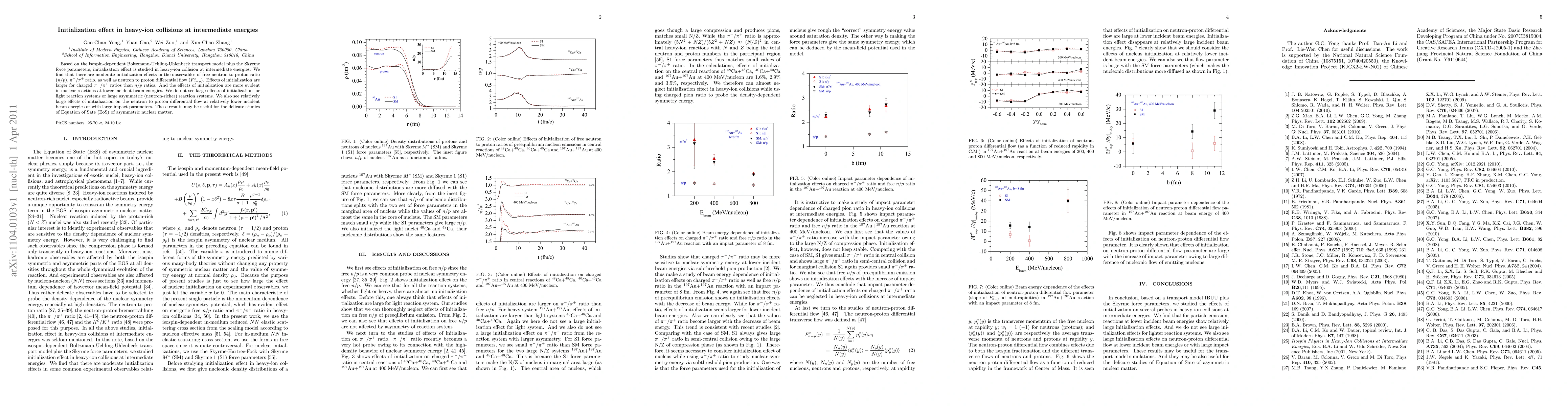 Based on the isospin-dependent Boltzmann-Uehling-Uhlenbeck transport model plus the Skyrme force parameters, initialization effect is studied in heavy-ion collision at intermediate energies. We find that there are moderate initialization effects in the observables of free neutron to proton ratio (n/p), pion-/pion + ratio, as well as neutron to proton differential flow (F^x_n-p). Effects of initialization are larger for charged pion-/pion ratios than n/p ratios. And the effects of initialization are more evident in nuclear reactions at lower incident beam energies. We do not see large effects of initialization for light reaction systems or large asymmetric (neutron-richer) reaction systems. We also see relatively large effects of initialization on the neutron to proton differential flow at relatively lower incident beam energies or with large impact parameters. These results may be useful for the delicate studies of Equation of Sate (EoS) of asymmetric nuclear matter.
