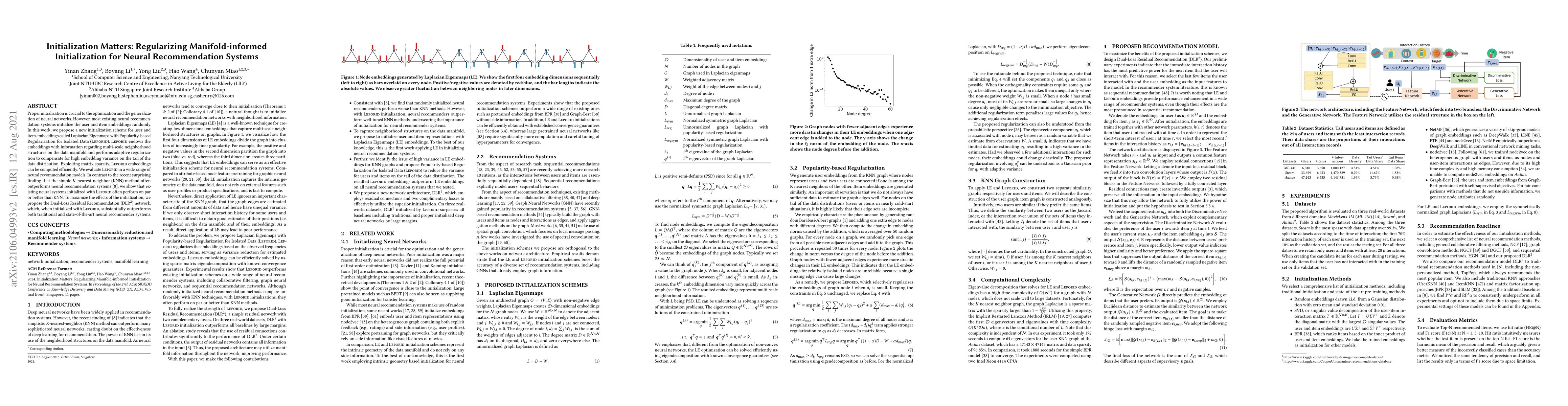 Proper initialization is crucial to the optimization and the generalization of neural networks. However, most existing neural recommendation systems initialize the user and item embeddings randomly. In this work, we propose a new initialization scheme for user and item embeddings called Laplacian Eigenmaps with Popularity-based Regularization for Isolated Data (LEPORID). LEPORID endows the embeddings with information regarding multi-scale neighborhood structures on the data manifold and performs adaptive regularization to compensate for high embedding variance on the tail of the data distribution. Exploiting matrix sparsity, LEPORID embeddings can be computed efficiently. We evaluate LEPORID in a wide range of neural recommendation models. In contrast to the recent surprising finding that the simple K-nearest-neighbor (KNN) method often outperforms neural recommendation systems, we show that existing neural systems initialized with LEPORID often perform on par or better than KNN. To maximize the effects of the initialization, we propose the Dual-Loss Residual Recommendation (DLR2) network, which, when initialized with LEPORID, substantially outperforms both traditional and state-of-the-art neural recommender systems.
