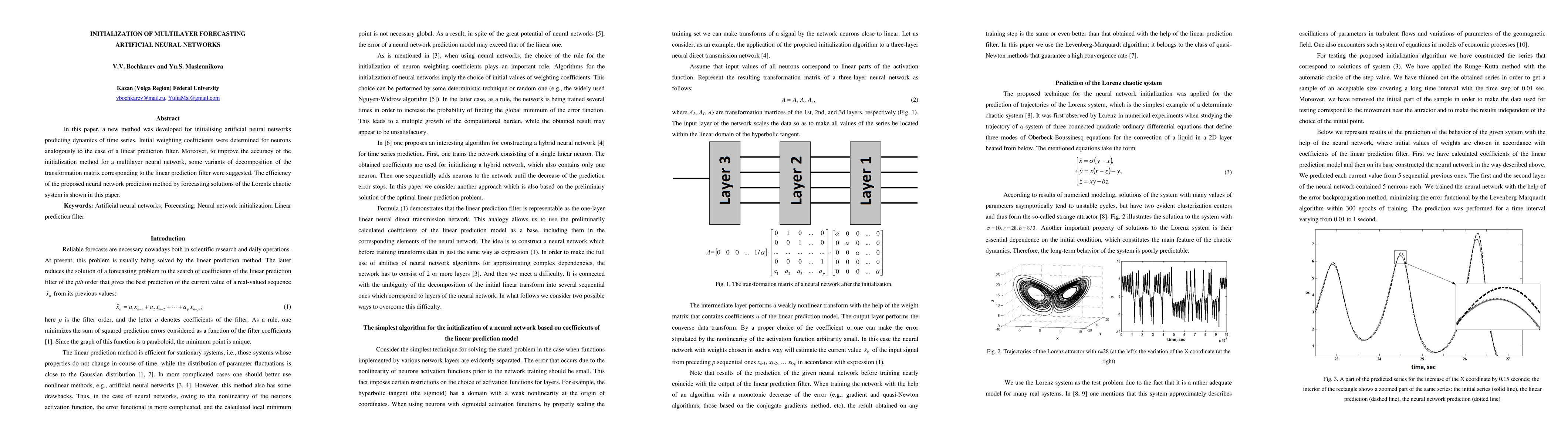 This paper introduces a novel initialization method for multilayer artificial neural networks used in time series forecasting, employing linear prediction filter analogies and matrix decomposition techniques to enhance accuracy. The effectiveness of the proposed method is demonstrated through its application in predicting the chaotic solutions of the Lorentz system.