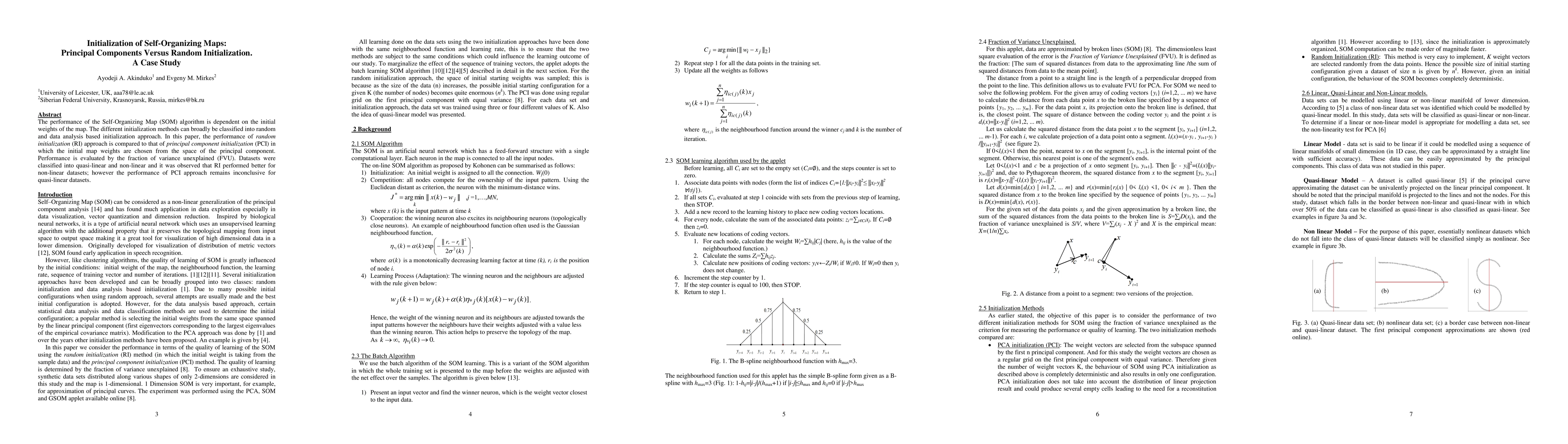 This paper compares the performance of random initialization (RI) versus principal component initialization (PCI) for Self-Organizing Maps (SOMs), finding RI superior for non-linear datasets, while PCI's effectiveness for quasi-linear datasets remains inconclusive. Performance is evaluated using the fraction of variance unexplained (FVU).