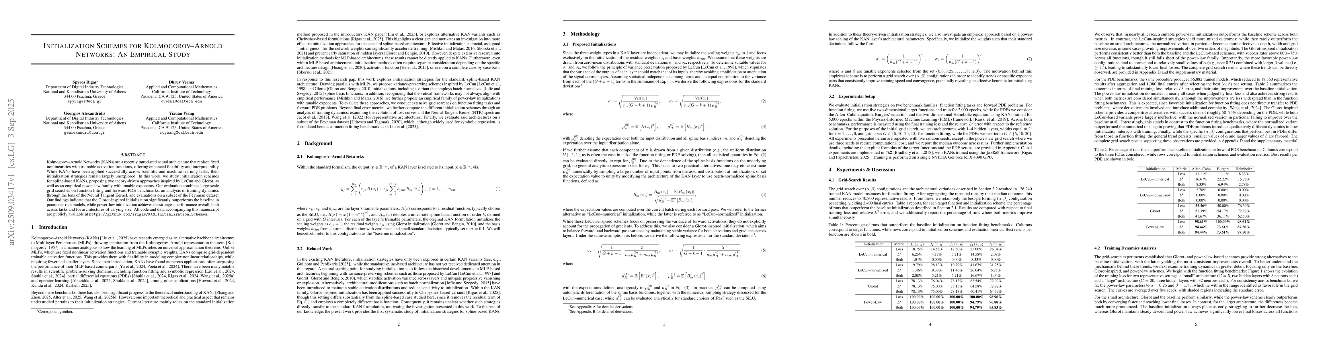 Kolmogorov-Arnold Networks (KANs) are a recently introduced neural architecture that replace fixed nonlinearities with trainable activation functions, offering enhanced flexibility and interpretability. While KANs have been applied successfully across scientific and machine learning tasks, their initialization strategies remain largely unexplored. In this work, we study initialization schemes for spline-based KANs, proposing two theory-driven approaches inspired by LeCun and Glorot, as well as an empirical power-law family with tunable exponents. Our evaluation combines large-scale grid searches on function fitting and forward PDE benchmarks, an analysis of training dynamics through the lens of the Neural Tangent Kernel, and evaluations on a subset of the Feynman dataset. Our findings indicate that the Glorot-inspired initialization significantly outperforms the baseline in parameter-rich models, while power-law initialization achieves the strongest performance overall, both across tasks and for architectures of varying size. All code and data accompanying this manuscript are publicly available at https://github.com/srigas/KAN_Initialization_Schemes.
