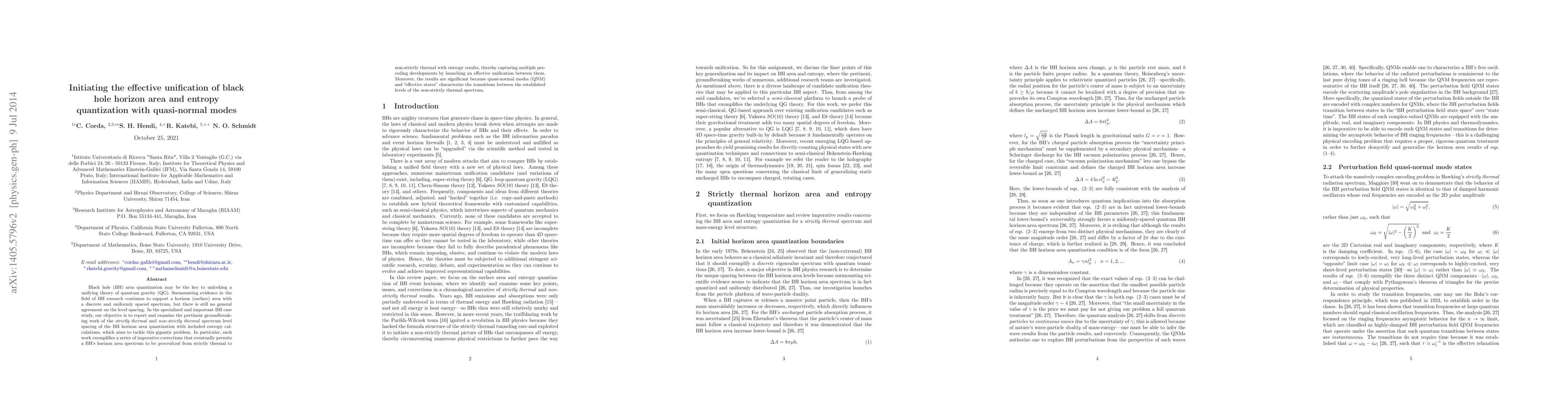 This paper explores the unification of black hole horizon area quantization and entropy with quasi-normal modes, proposing corrections to generalize the horizon area spectrum from strictly thermal to non-strictly thermal. The study highlights the significance of quasi-normal modes in characterizing transitions between these levels, aiming to resolve discrepancies in the quantization of black hole entropy.