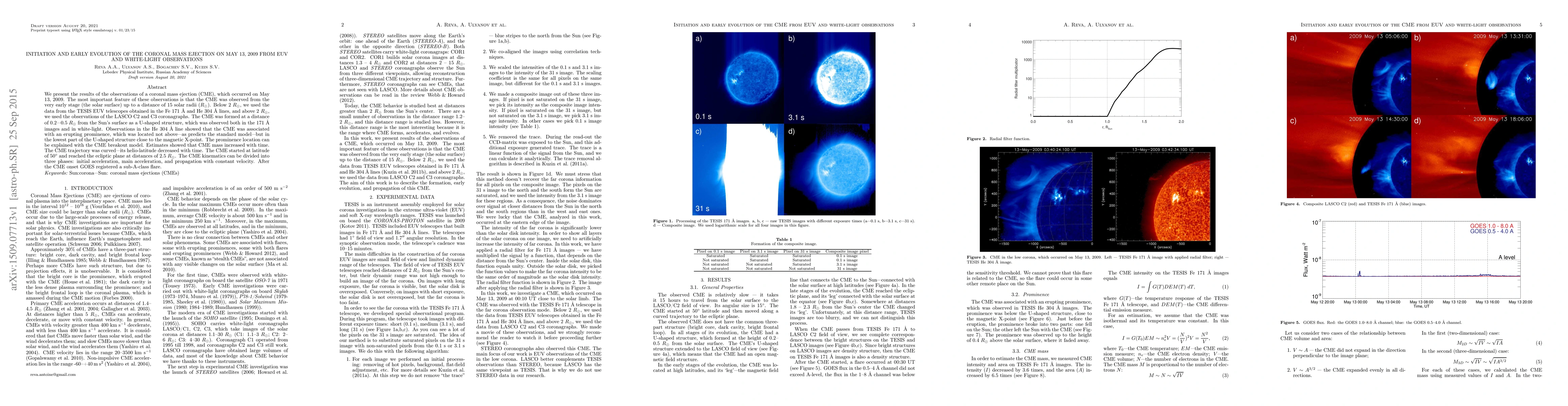 A coronal mass ejection was observed from May 13, 2009, with CME formation at 0.2-0.5 solar radii, exhibiting U-shaped structure and associated with an erupting prominence.