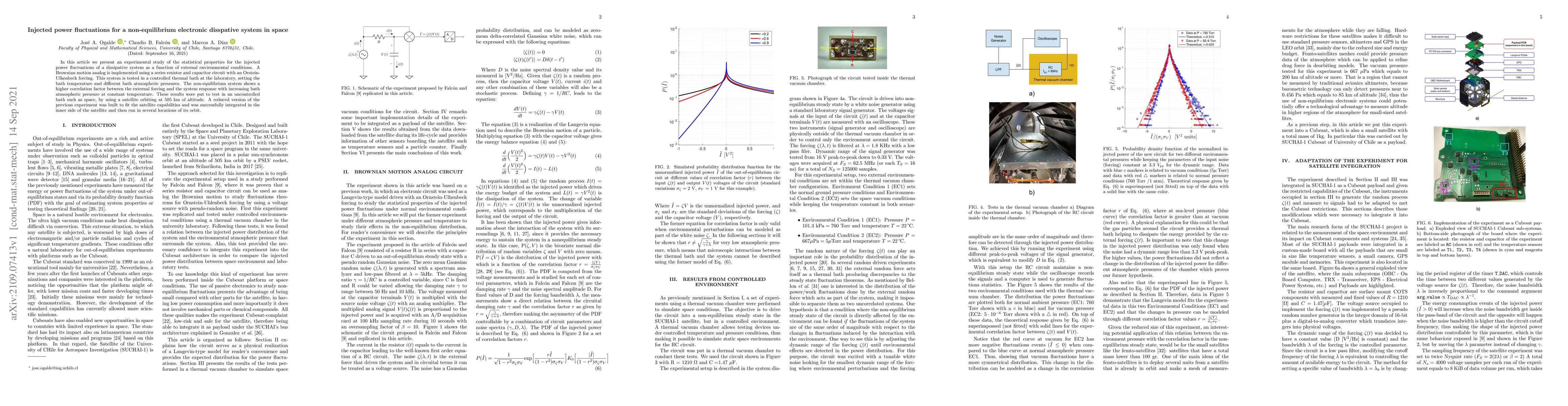 In this article we present an experimental study of the statistical properties for the injected power fluctuations of a dissipative system as a function of external environmental conditions. A Brownian motion analog is implemented using a series resistor and capacitor circuit with an Orstein-Ulhenbeck forcing. This system is tested in a controlled thermal bath at the laboratory, setting the bath temperature and different bath atmospheric pressures. The non-equilibrium system shows a higher correlation factor between the external forcing and the system response with increasing bath atmospheric pressure at constant temperature. These results were put to test in an uncontrolled bath such as space, by using a satellite orbiting at 505 km of altitude. A reduced version of the previous experiment was built to fit the satellite capabilities and was successfully integrated in the inner side of the satellite and then run in several locations of its orbit.
