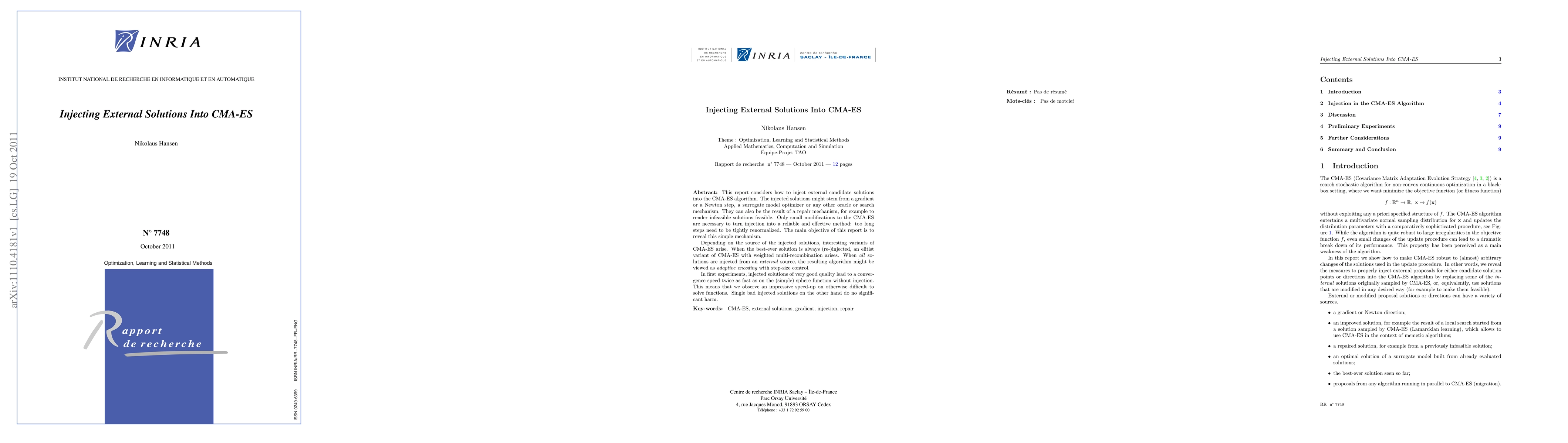 This paper explores integrating external candidate solutions into the CMA-ES algorithm, demonstrating that minor modifications can effectively incorporate these solutions, leading to faster convergence and improved performance on complex optimization problems. Experiments show a significant speed-up when high-quality solutions are injected, while poor solutions have minimal negative impact.