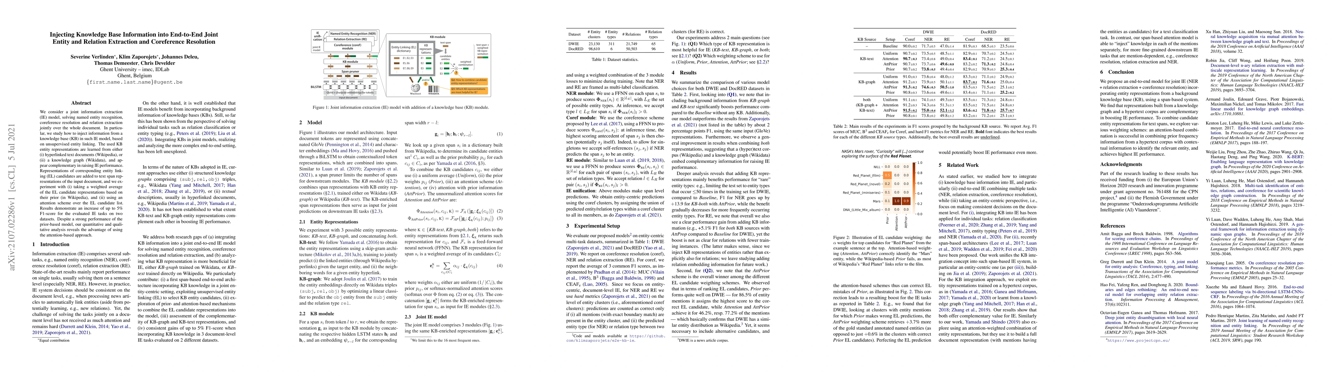 This paper proposes a joint information extraction model that integrates knowledge base information through unsupervised entity linking, enhancing named entity recognition, coreference resolution, and relation extraction. Experiments show a 5% F1-score improvement using either weighted average or attention-based methods, with the latter proving more effective.