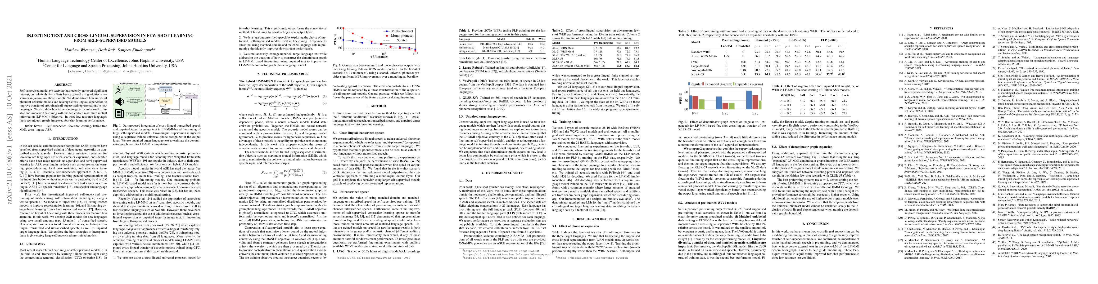 Self-supervised model pre-training has recently garnered significant interest, but relatively few efforts have explored using additional resources in fine-tuning these models. We demonstrate how universal phoneset acoustic models can leverage cross-lingual supervision to improve transfer of pretrained self-supervised representations to new languages. We also show how target-language text can be used to enable and improve fine-tuning with the lattice-free maximum mutual information (LF-MMI) objective. In three low-resource languages these techniques greatly improved few-shot learning performance.