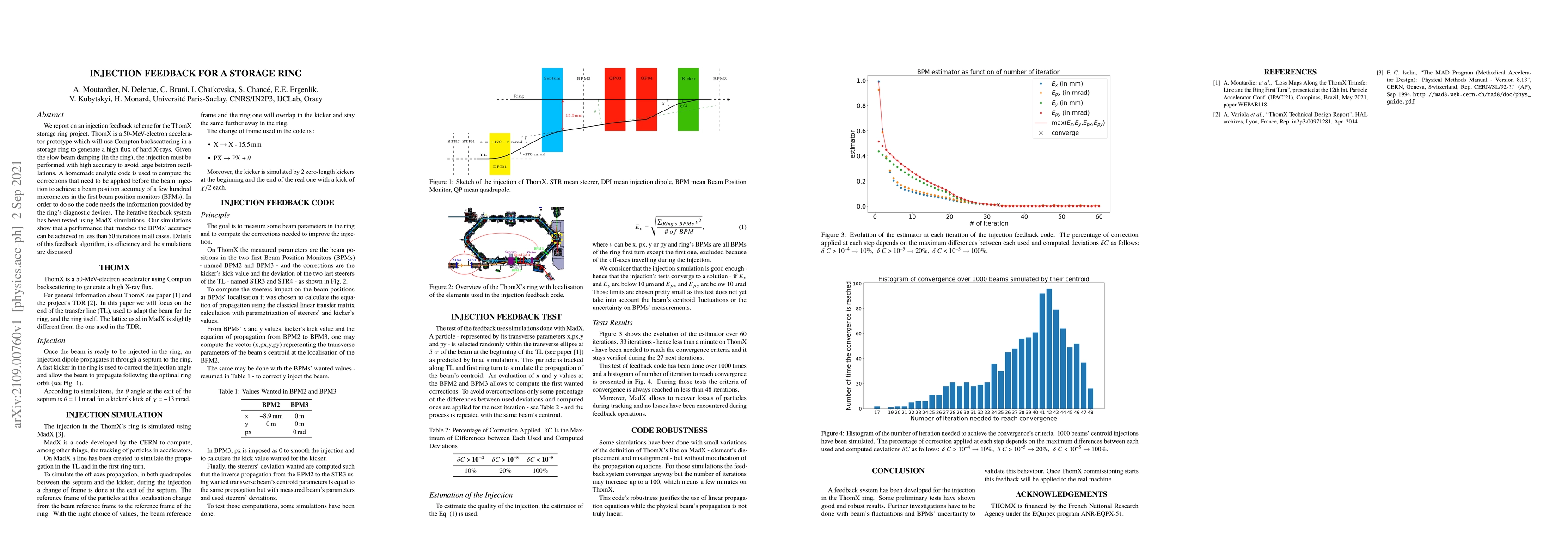 The research employs an injection feedback scheme for the ThomX storage ring project, using a homemade analytic code to compute corrections for beam injection accuracy. MadX simulations are used to test the iterative feedback system.