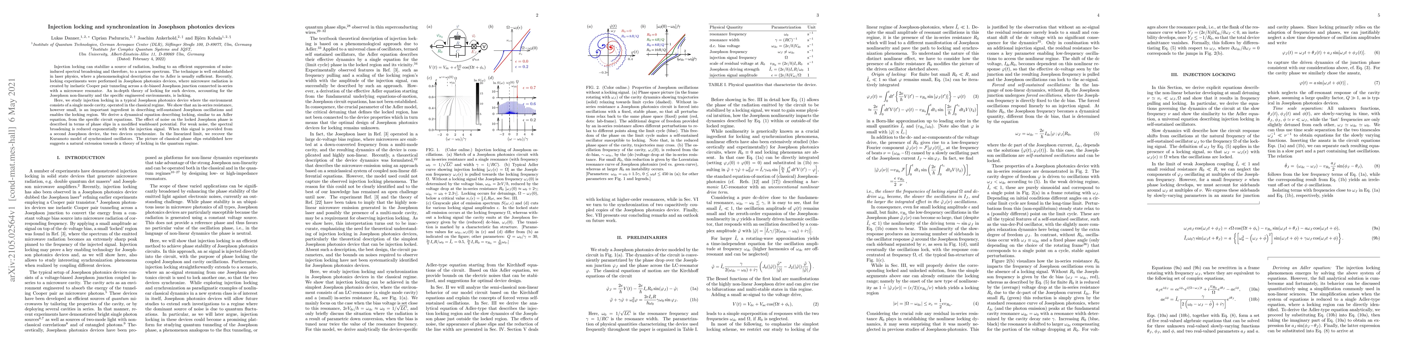 This paper investigates the injection locking phenomenon in Josephson photonics devices, demonstrating that a small in-series resistance is crucial for describing self-sustained oscillations and the locking region. The authors derive a dynamical equation for locking and show that noise-induced spectral broadening is significantly reduced, leading to synchronization between two Josephson devices.