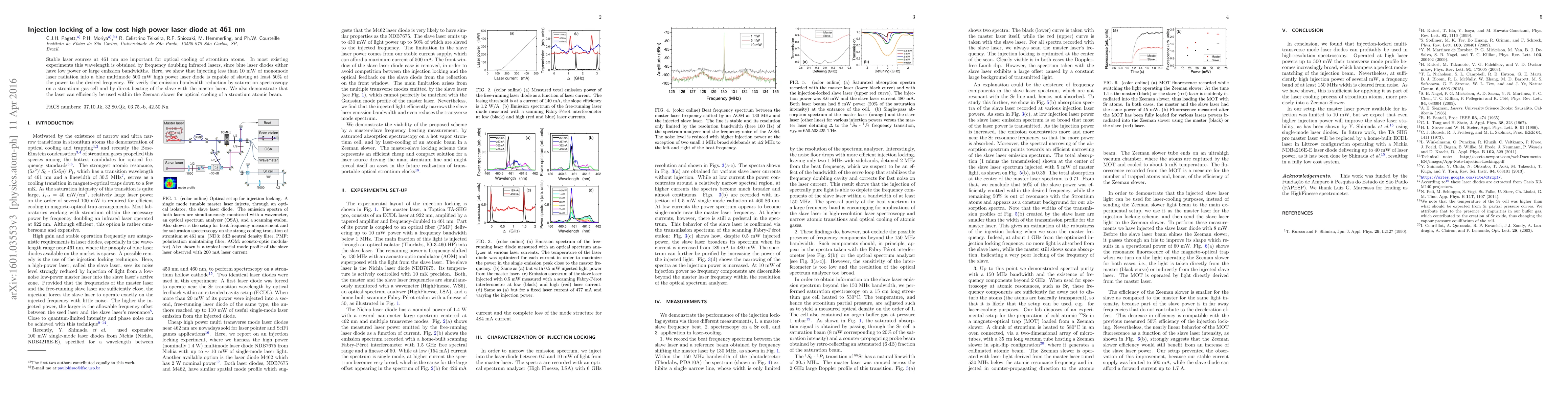 This research demonstrates the injection locking of a high power blue laser diode to achieve a stable 461 nm laser source, crucial for optical cooling of strontium atoms. By injecting less than 10 mW of monomode laser radiation, at least 50% of the diode's power is slaving to the desired frequency, verified through bandwidth reduction tests and effective use in a Zeeman slower for atomic cooling.