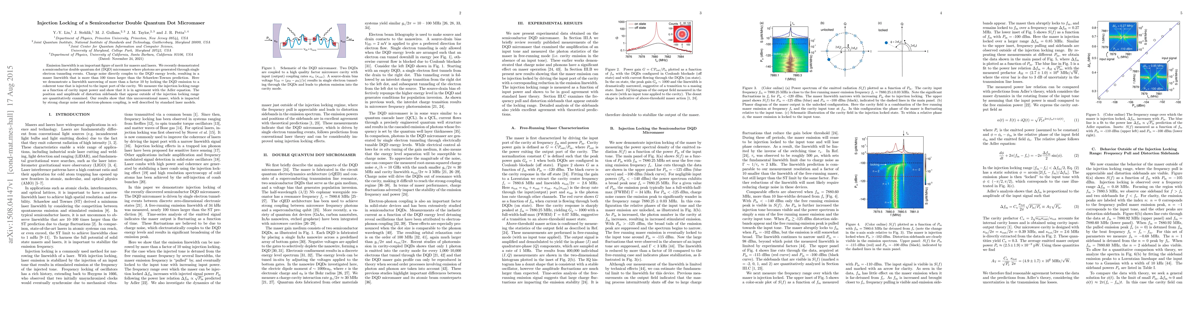 This paper demonstrates linewidth narrowing of a semiconductor double quantum dot micromaser by injecting a coherent tone to lock the emission, achieving a factor of 10 reduction in linewidth. The study aligns the injection locking range with the Adler equation and examines distortion sidebands, showing that the maser's behavior is consistent with standard laser models despite strong charge noise and electron-phonon coupling.