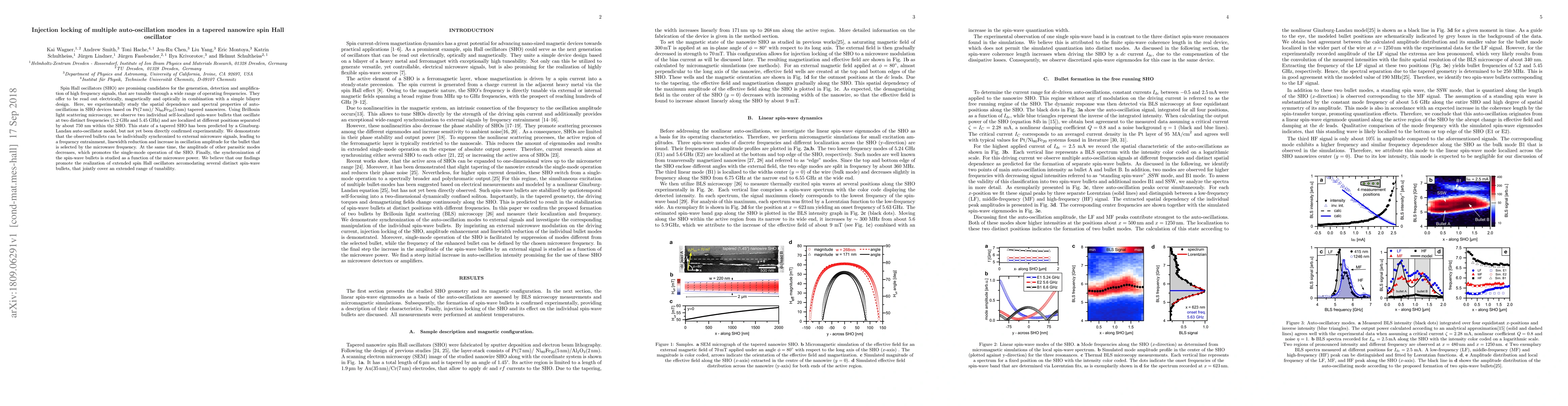 This paper investigates the injection locking of multiple auto-oscillation modes in a tapered nanowire spin Hall oscillator, demonstrating the synchronization of two distinct spin-wave bullets to external microwave signals, which enhances single-mode operation and extends the device's tunable frequency range.