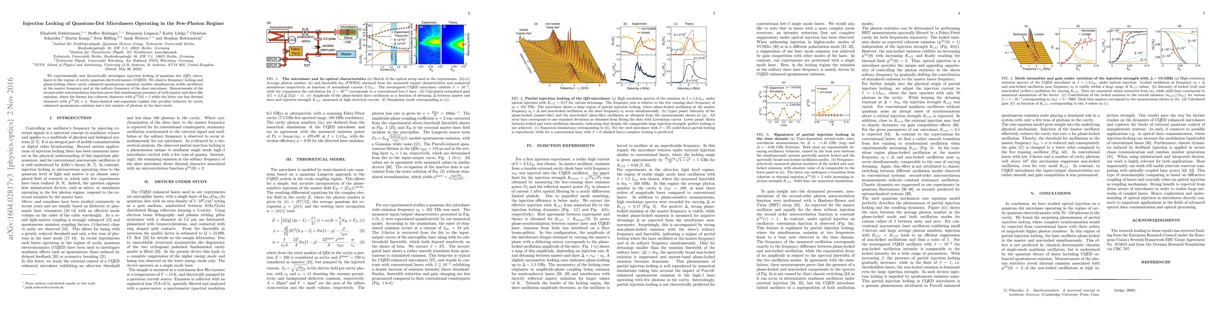 This paper investigates the injection locking of quantum dot microlasers in the few photon regime, demonstrating frequency and phase locking through cavity enhanced spontaneous emission. The study reveals stable oscillations at both master and slave frequencies, confirmed by second-order autocorrelation measurements and explained by semi-classical rate-equations.