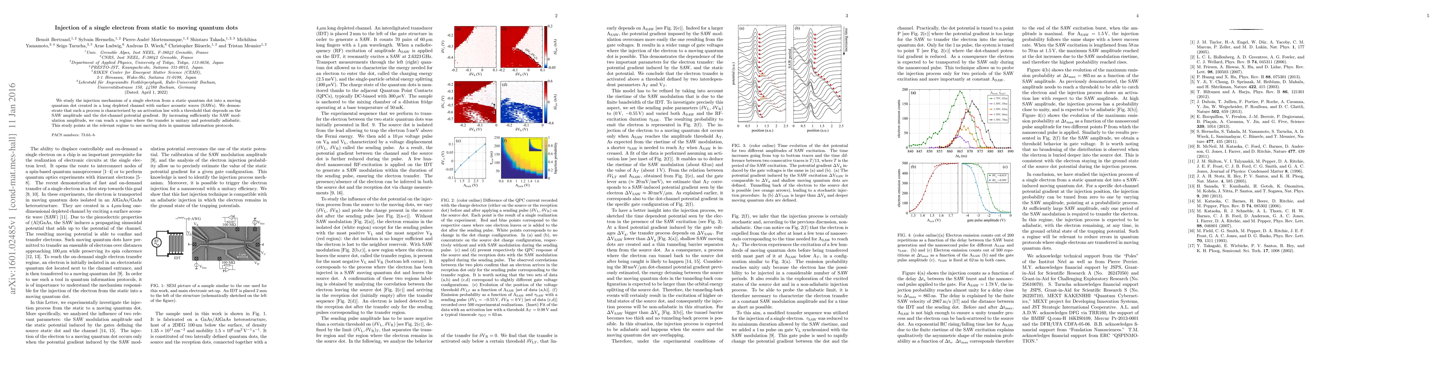 We study the injection mechanism of a single electron from a static quantum dot into a moving quantum dot created in a long depleted channel with surface acoustic waves (SAWs). We demonstrate that such a process is characterized by an activation law with a threshold that depends on the SAW amplitude and the dot-channel potential gradient. By increasing sufficiently the SAW modulation amplitude, we can reach a regime where the transfer is unitary and potentially adiabatic. This study points at the relevant regime to use moving dots in quantum information protocols.