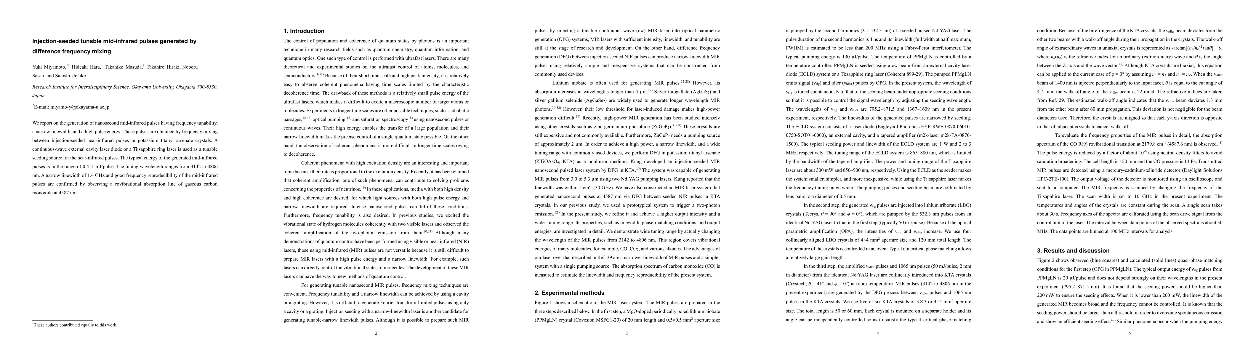 This research generates tunable mid-infrared pulses via difference frequency mixing between injection-seeded near-infrared pulses in potassium titanyl arsenate crystals, achieving high pulse energy and narrow linewidth, with tuning range from 3142 to 4806 nm. The method employs a continuous-wave external cavity laser diode or Ti:sapphire ring laser as the seeding source.