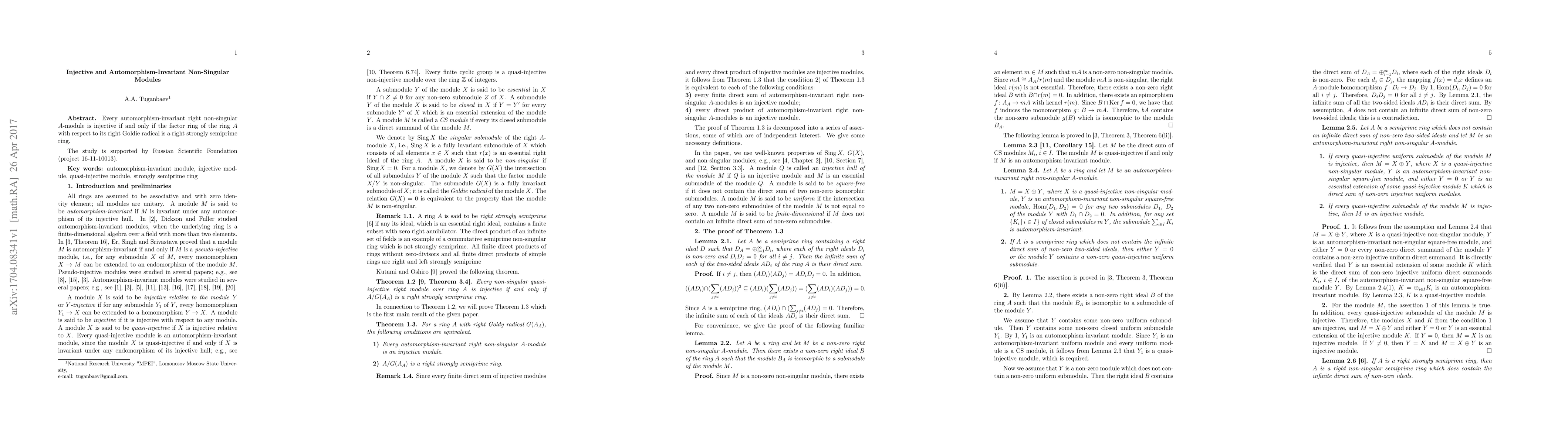 Summary: This paper establishes a condition for right non-singular $A$-modules to be injective, showing that such modules are injective if and only if the factor ring of $A$ modulo its right Goldie radical is right strongly semiprime. Automorphism-invariance plays a crucial role in this equivalence.