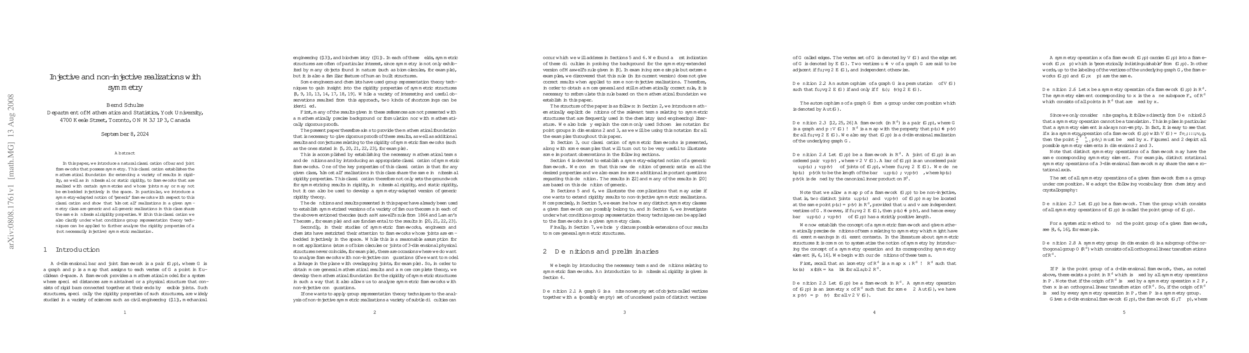 In this paper, we introduce a natural classification of bar and joint frameworks that possess symmetry. This classification establishes the mathematical foundation for extending a variety of results in rigidity, as well as infinitesimal or static rigidity, to frameworks that are realized with certain symmetries and whose joints may or may not be embedded injectively in the space. In particular, we introduce a symmetry-adapted notion of `generic' frameworks with respect to this classification and show that `almost all' realizations in a given symmetry class are generic and all generic realizations in this class share the same infinitesimal rigidity properties. Within this classification we also clarify under what conditions group representation theory techniques can be applied to further analyze the rigidity properties of a (not necessarily injective) symmetric realization.