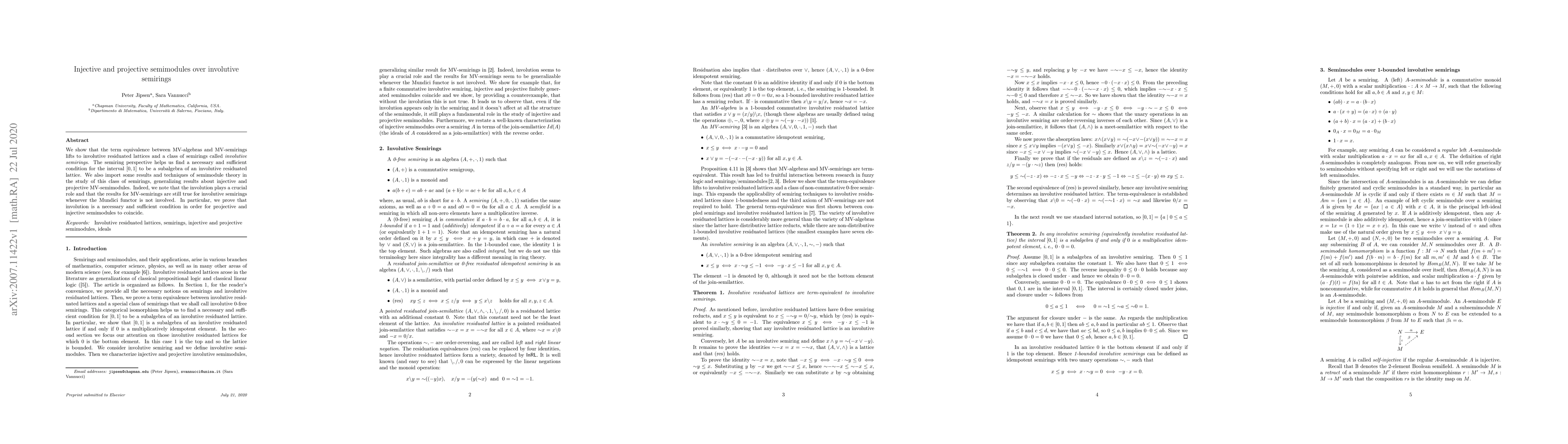 This paper establishes a connection between involutive semirings and involutive residuated lattices, showing that involution is necessary and sufficient for projective and injective semimodules to coincide. It also generalizes results on MV-semimodules using semiring theory.