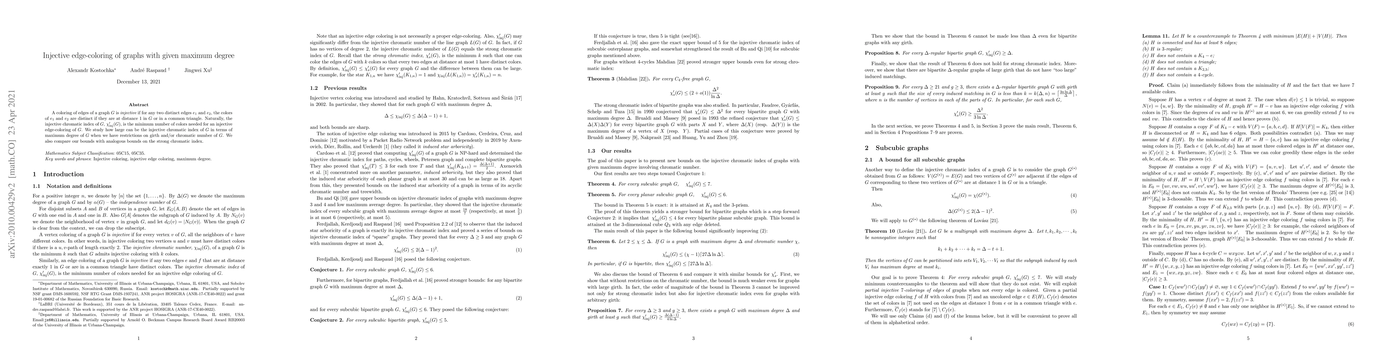 This paper investigates the injective chromatic index of graphs, focusing on the minimum number of colors required for an injective edge-coloring under restrictions on maximum degree, girth, and chromatic number. It compares these bounds with those for the strong chromatic index.
