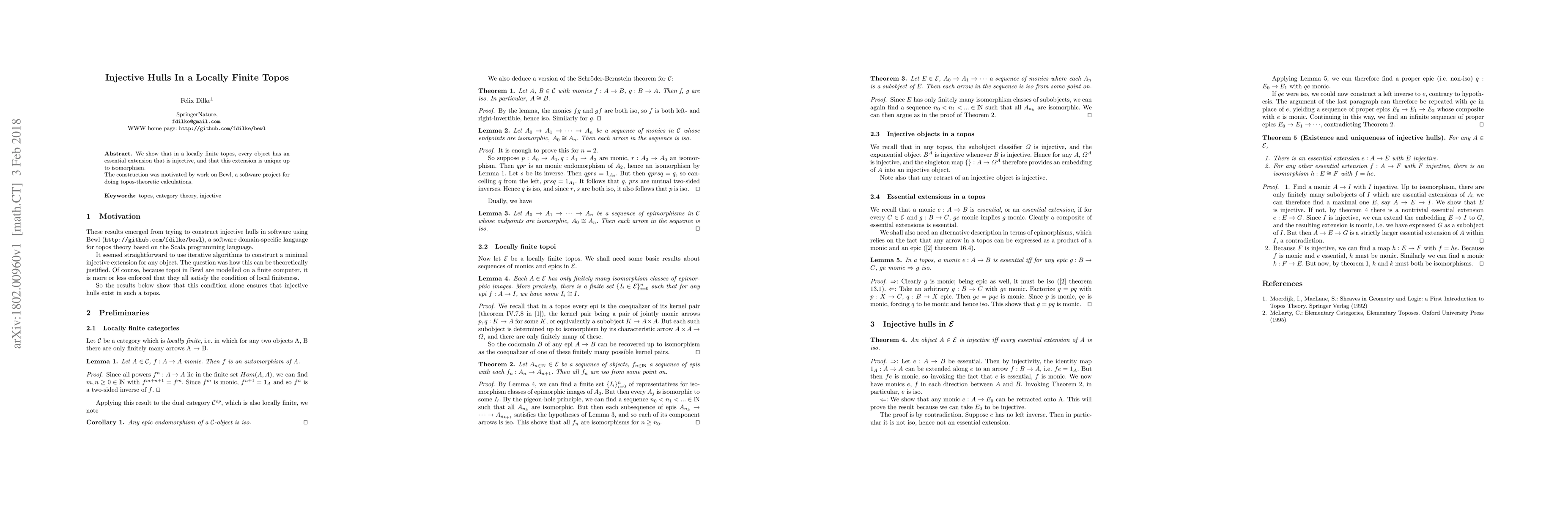 Summary: This paper demonstrates that in a locally finite topos, every object possesses an injective essential extension, which is unique up to isomorphism. The research was inspired by the Bewl project, aimed at facilitating topos-theoretic computations.