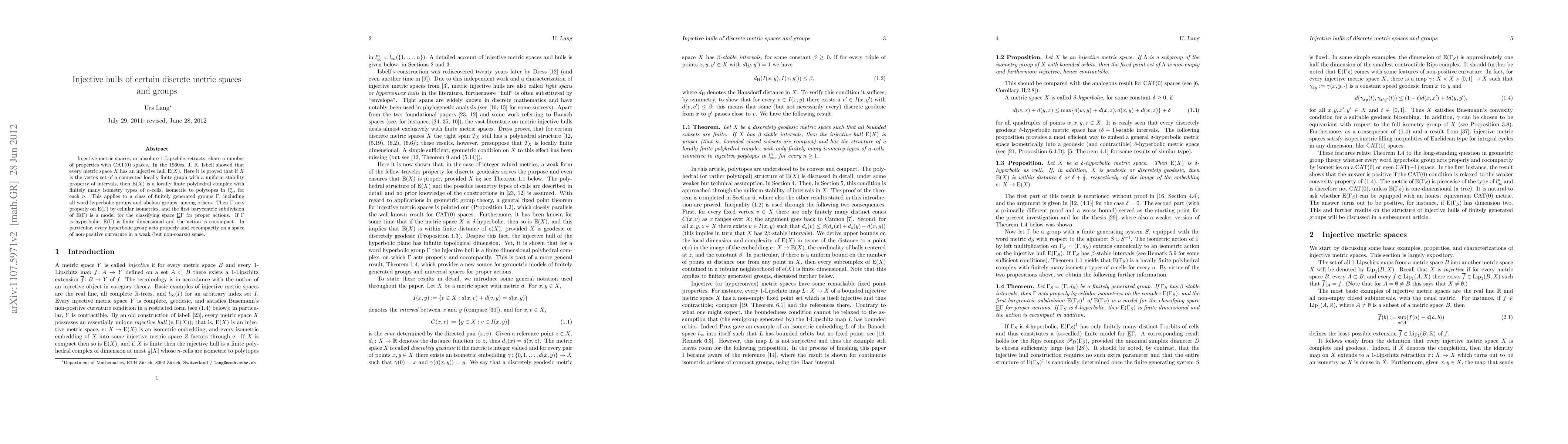 Injective metric spaces, or absolute 1-Lipschitz retracts, share a number of properties with CAT(0) spaces. In the 1960es, J. R. Isbell showed that every metric space X has an injective hull E(X). Here it is proved that if X is the vertex set of a connected locally finite graph with a uniform stability property of intervals, then E(X) is a locally finite polyhedral complex with finitely many isometry types of n-cells, isometric to polytopes in l^n_\infty, for each n. This applies to a class of finitely generated groups G, including all word hyperbolic groups and abelian groups, among others. Then G acts properly on E(G) by cellular isometries, and the first barycentric subdivision of E(G) is a model for the classifying space \underbar{E}G for proper actions. If G is hyperbolic, E(G) is finite dimensional and the action is cocompact. In particular, every hyperbolic group acts properly and cocompactly on a space of non-positive curvature in a weak (but non-coarse) sense.