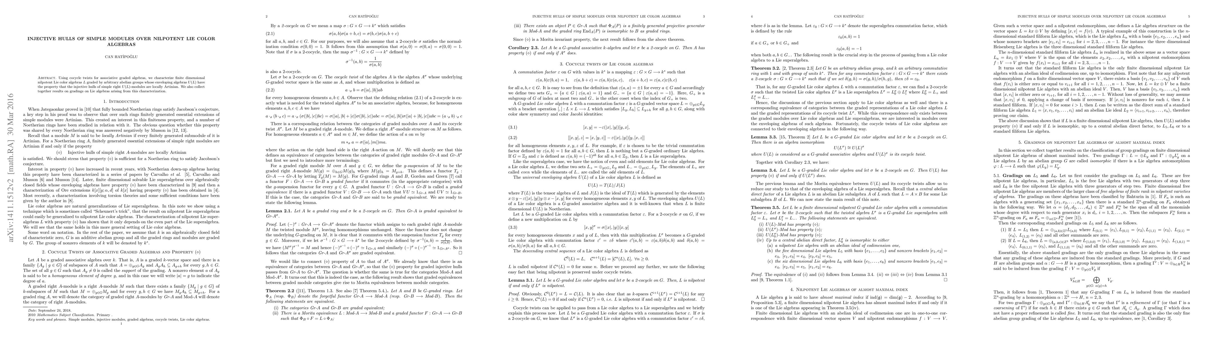 The paper characterizes finite-dimensional nilpotent Lie color algebras whose injective hulls of simple modules have locally Artinian properties, using cocycle twists for associative graded algebras. It also compiles results on gradings on Lie algebras derived from this characterization.