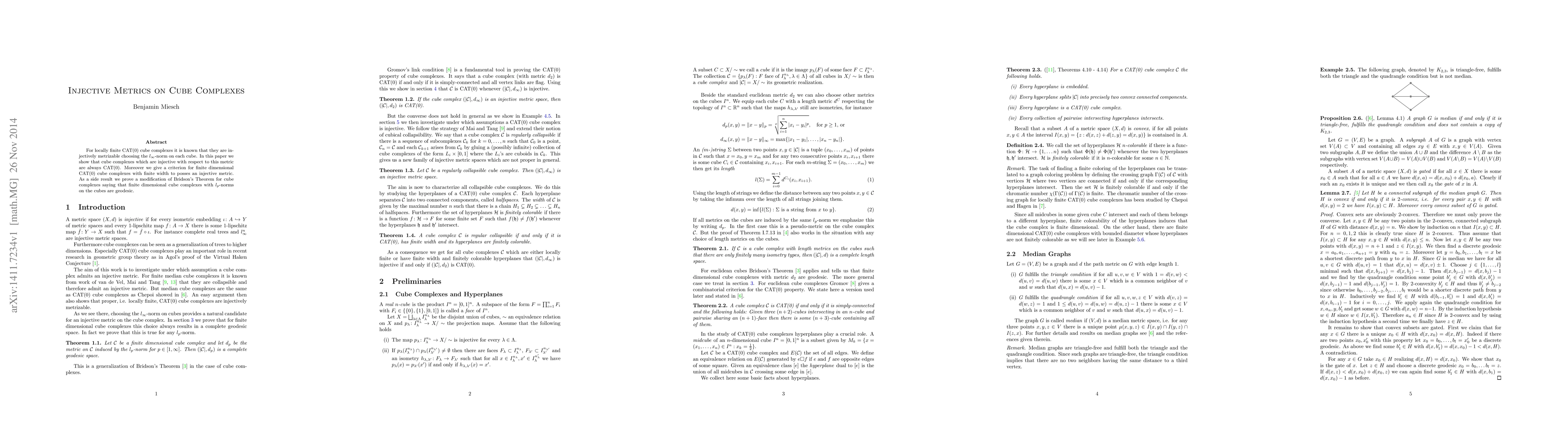 This paper demonstrates that injective metrics on locally finite CAT(0) cube complexes imply that the complexes are CAT(0). It also provides a criterion for finite-dimensional CAT(0) cube complexes with finite width to have injective metrics and proves a modified version of Bridson's Theorem for geodesic properties of such complexes.
