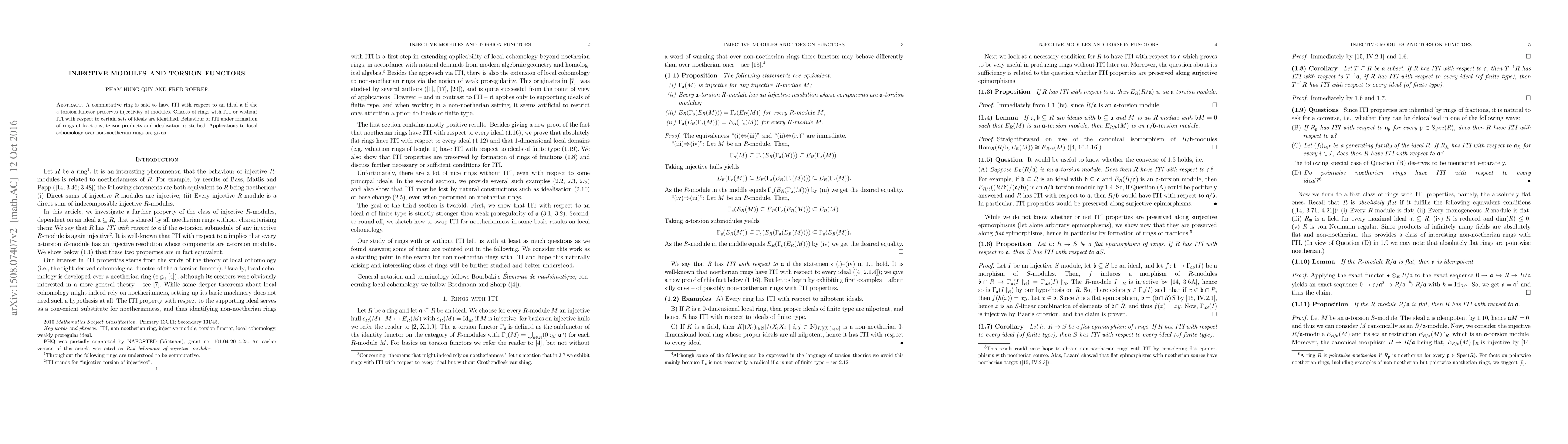 This paper investigates rings that maintain injective module properties under certain torsion functors, termed ITI (Injective Torsion Invariant) with respect to specific ideals. It explores the behavior of ITI in various ring constructions and applies findings to local cohomology in non-noetherian settings.