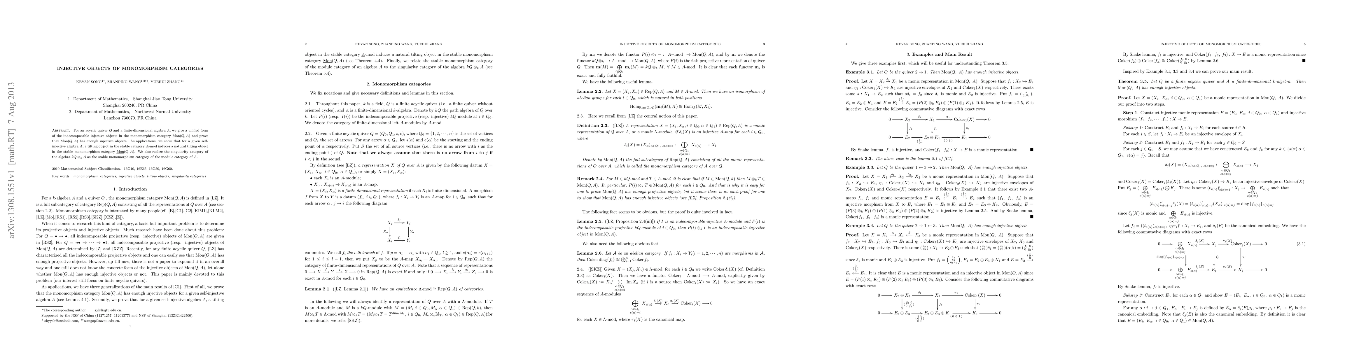For an acyclic quiver $Q$ and a finite-dimensional algebra $A$, we give a unified form of the indecomposable injective objects in the monomorphism category ${\rm Mon}(Q,A)$ and prove that ${\rm Mon}(Q, A)$ has enough injective objects. As applications, we show that for a given self-injective algebra $A$, a tilting object in the stable category $\underline{A}$-mod induces a natural tilting object in the stable monomorphism category $\underline{\rm Mon}(Q,A)$. We also realize the singularity category of the algebra $kQ\otimes_k A$ as the stable monomorphism category of the module category of $A$.