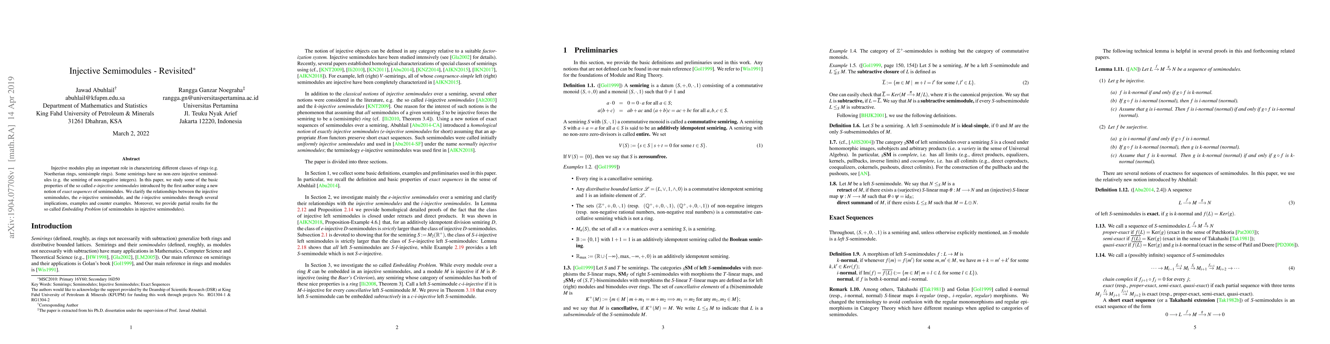 This paper investigates the properties of e-injective semimodules, a class of injective modules for semirings, using a new notion of exact sequences. It clarifies distinctions and relationships between various types of injective semimodules and explores the Embedding Problem for semimodules within injective ones.