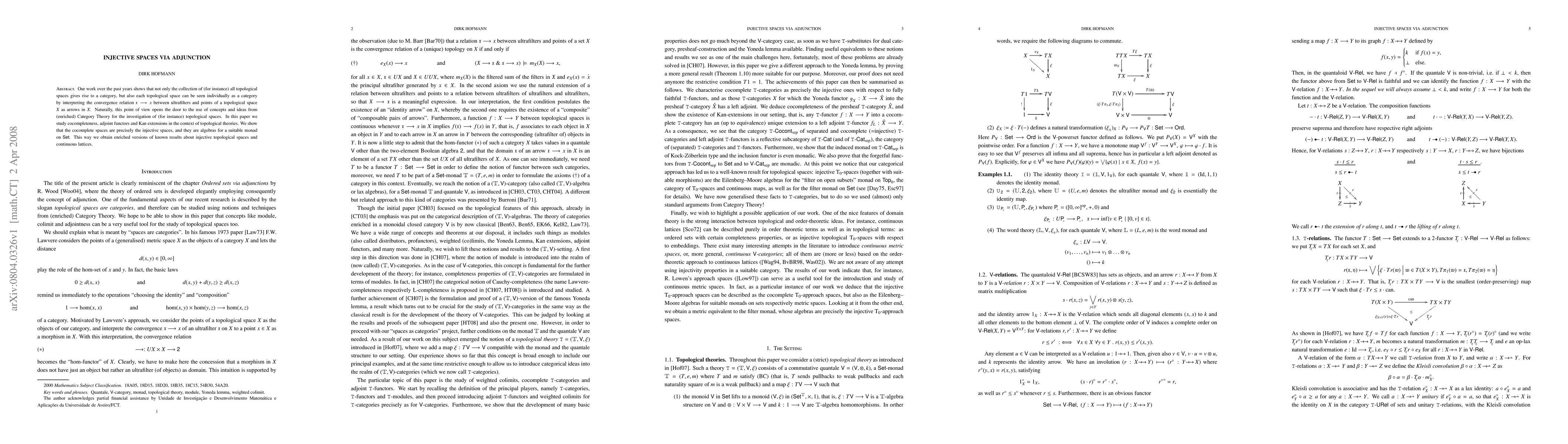 Our work over the past years shows that not only the collection of (for instance) all topological spaces gives rise to a category, but also each topological space can be seen individually as a category by interpreting the convergence relation $\mathfrak{x}\to x$ between ultrafilters and points of a topological space $X$ as arrows in $X$. Naturally, this point of view opens the door to the use of concepts and ideas from (enriched) Category Theory for the investigation of (for instance) topological spaces. In this paper we study cocompleteness, adjoint functors and Kan extensions in the context of topological theories. We show that the cocomplete spaces are precisely the injective spaces, and they are algebras for a suitable monad on $\SET$. This way we obtain enriched versions of known results about injective topological spaces and continuous lattices.