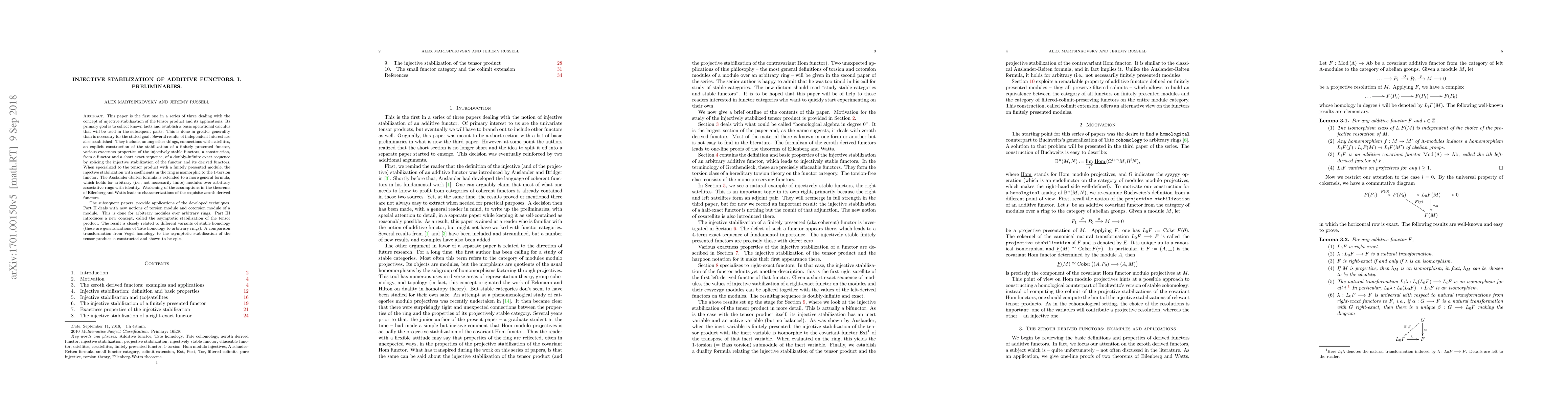 This paper establishes foundational concepts and operational calculus for injective stabilization of additive functors, laying groundwork for future applications. It includes connections with satellites, constructions of stabilizations, and extensions of the Auslander-Reiten formula for modules over associative rings.