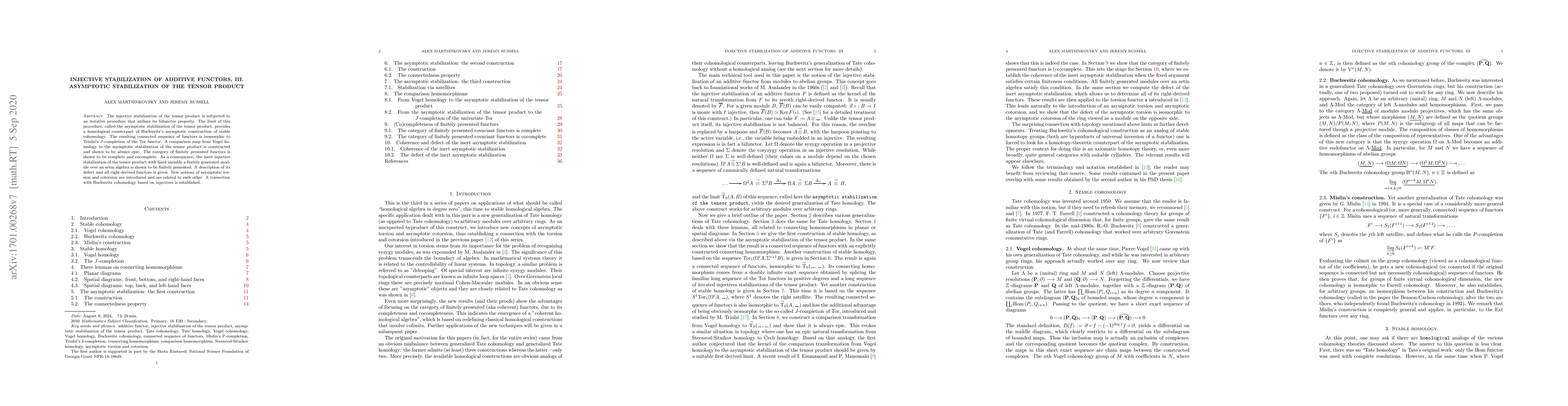 This paper explores the injective stabilization of tensor products through an iterative process, revealing an asymptotic stabilization that parallels Buchweitz's stable cohomology construction. The study establishes the category of finitely presented functors as complete and cocomplete, and shows a surprising link between the asymptotic tensor product stabilization and Buchweitz cohomology based on injectives.