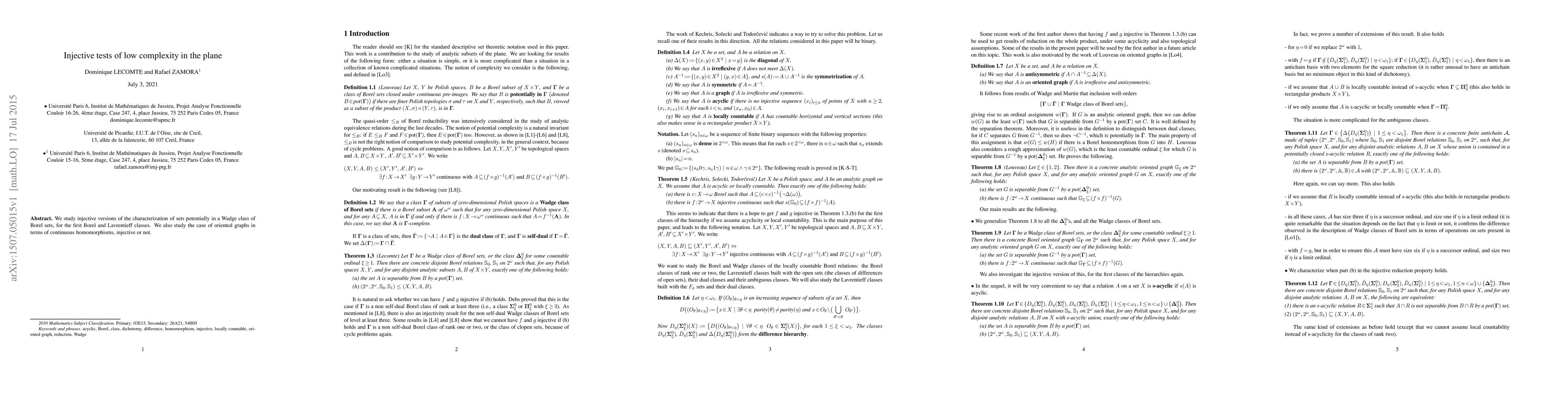 Summary: This paper explores injective tests for characterizing sets within the first Borel and Lavrentieff classes, and examines the role of continuous homomorphisms in the context of oriented graphs. The focus is on low complexity injective properties in planar sets.