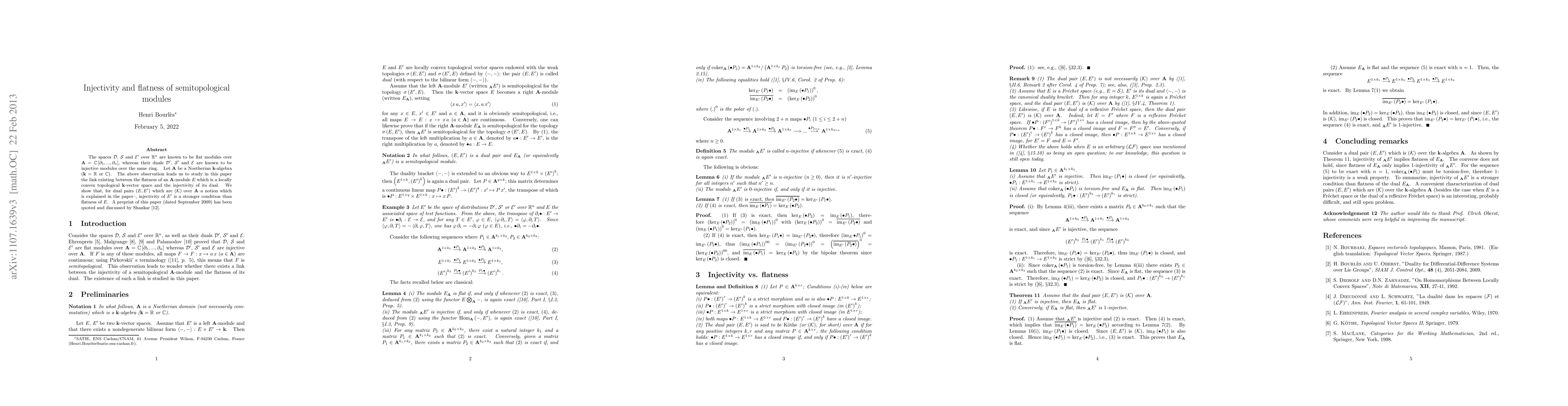 The spaces D, S and E' over \mathbb{R}^(n) are known to be flat modules over A=\mathbb{C}[\partial_{1},...,\partial_{n}], whereas their duals D', S' and E are known to be injective modules over the same ring. Let A be a Noetherian k-algebra (k=\mathbb{R} or \mathbb{C}). The above observation leads us to study in this paper the link existing between the flatness of an A-module E which is a locally convex topological k-vector space and the injectivity of its dual. We show that, for dual pairs (E,E') which are (K) over A--a notion which is explained in the paper--, injectivity of E' is a stronger condition than flatness of E. A preprint of this paper (dated September 2009) has been quoted and discussed by Shankar.