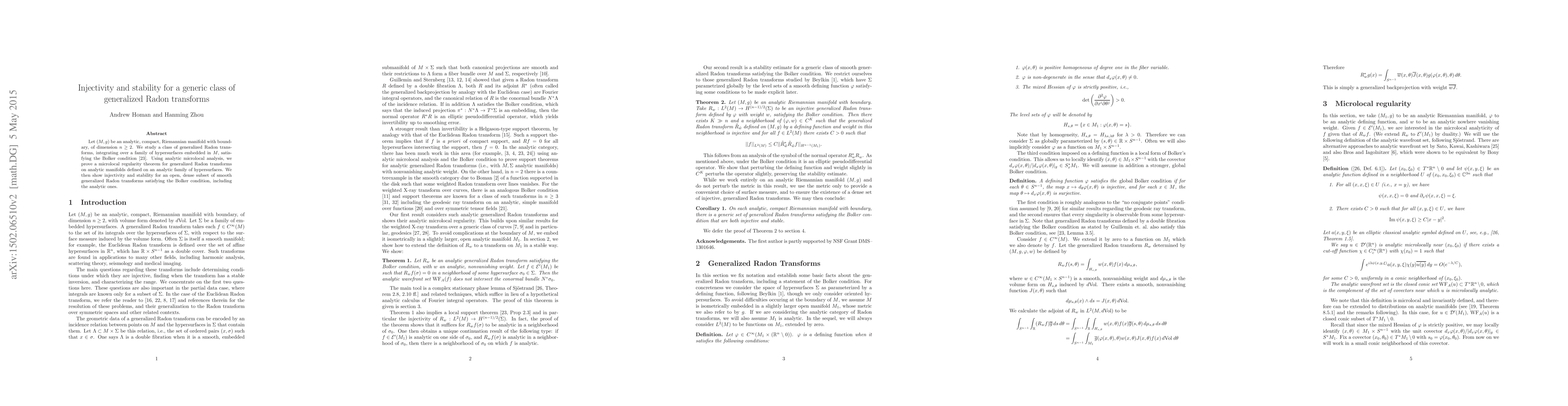 Let (M,g) be an analytic, compact, Riemannian manifold with boundary, of dimension n >= 2. We study a class of generalized Radon transforms, integrating over a family of hypersurfaces embedded in M, satisfying the Bolker condition [23]. Using analytic microlocal analysis, we prove a microlocal regularity theorem for generalized Radon transforms on analytic manifolds defined on an analytic family of hypersurfaces. We then show injectivity and stability for an open, dense subset of smooth generalized Radon transforms satisfying the Bolker condition, including the analytic ones.
