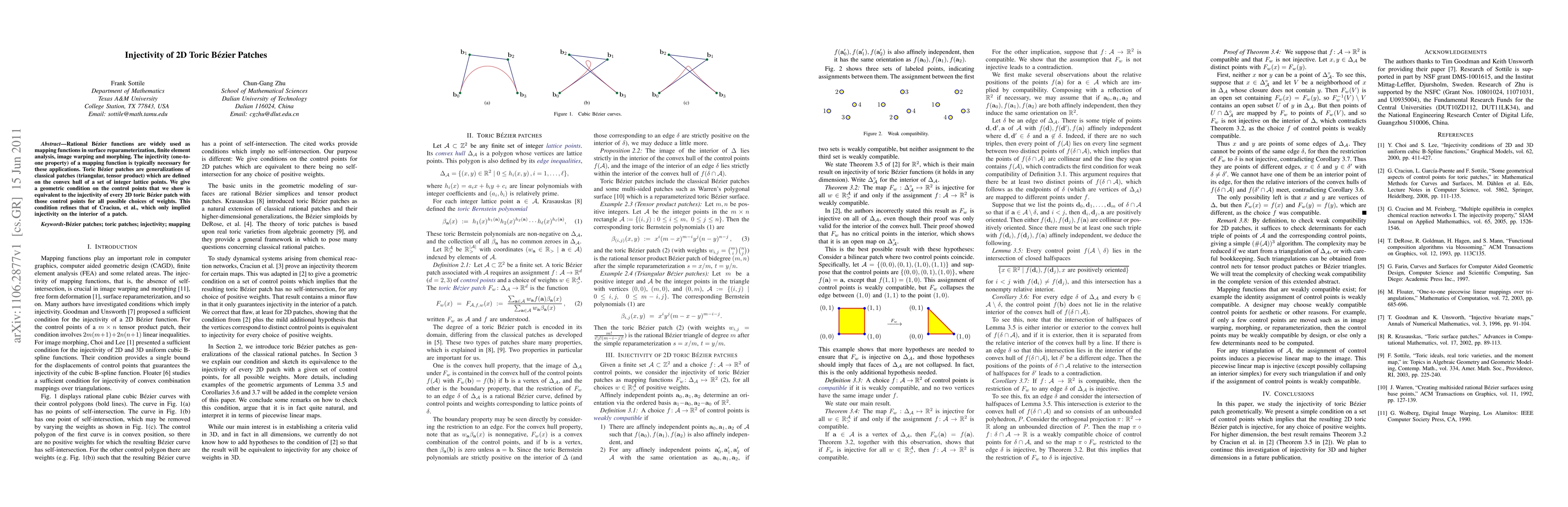 Rational B\'{e}zier functions are widely used as mapping functions in surface reparameterization, finite element analysis, image warping and morphing. The injectivity (one-to-one property) of a mapping function is typically necessary for these applications. Toric B\'{e}zier patches are generalizations of classical patches (triangular, tensor product) which are defined on the convex hull of a set of integer lattice points. We give a geometric condition on the control points that we show is equivalent to the injectivity of every 2D toric B\'{e}zier patch with those control points for all possible choices of weights. This condition refines that of Craciun, et al., which only implied injectivity on the interior of a patch.