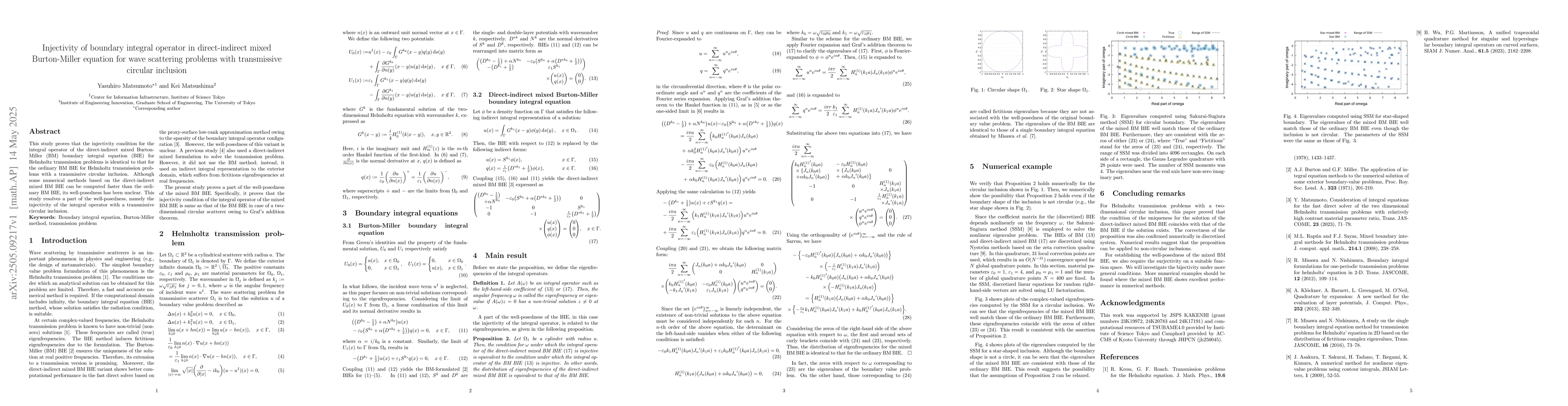 The research proves injectivity of the integral operator for the direct-indirect mixed Burton-Miller boundary integral equation (BIE) in wave scattering problems with transmissive circular inclusions.