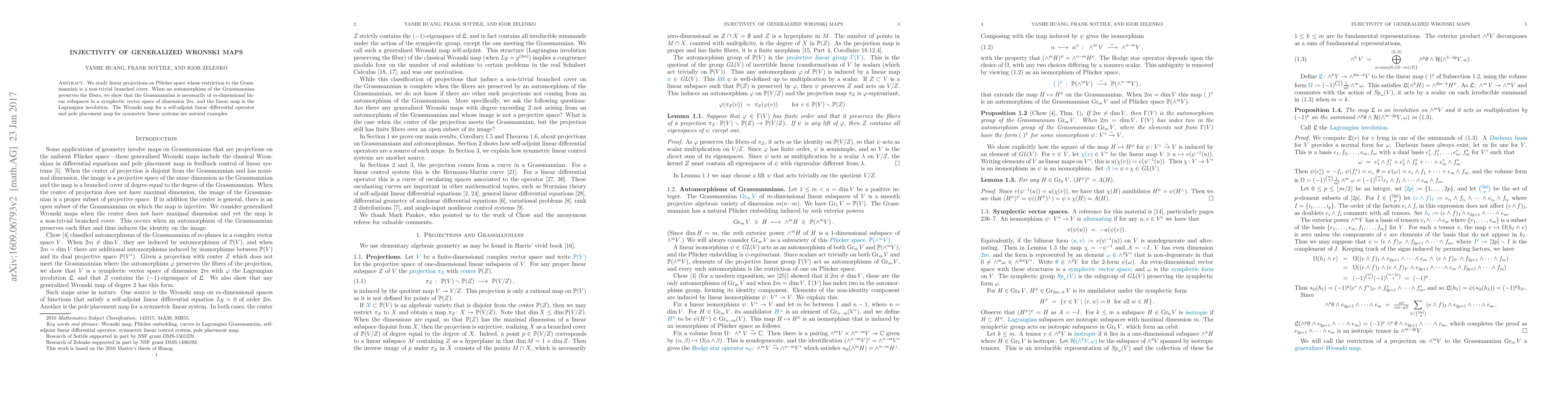 We study linear projections on Pluecker space whose restriction to the Grassmannian is a non-trivial branched cover. When an automorphism of the Grassmannian preserves the fibers, we show that the Grassmannian is necessarily of m-dimensional linear subspaces in a symplectic vector space of dimension 2m, and the linear map is the Lagrangian involution. The Wronski map for a self-adjoint linear differential operator and pole placement map for symmetric linear systems are natural examples.