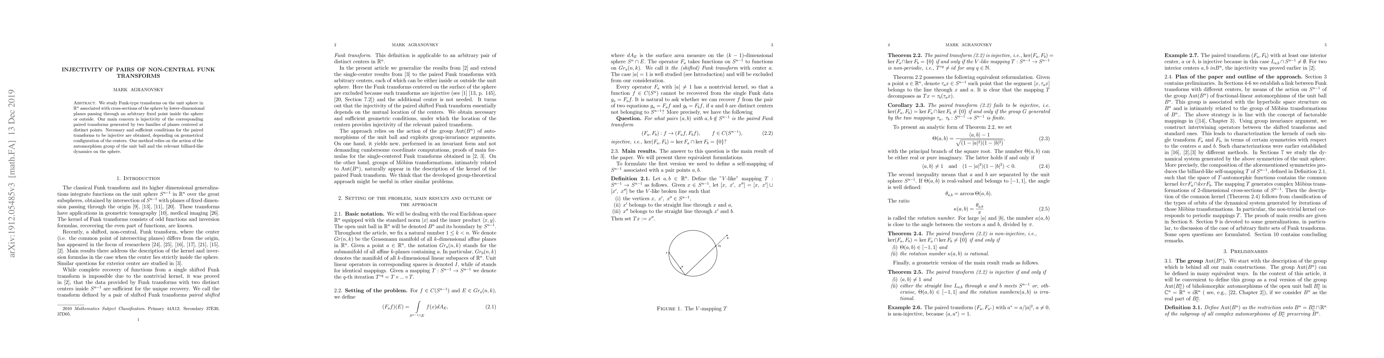 We study Funk-type transforms on the unit sphere in R^n associated with cross-sections of the sphere by lower-dimensional planes passing through an arbitrary fixed point inside the sphere or outside. Our main concern is injectivity of the corresponding paired transforms generated by two families of planes centered at distinct points. Necessary and sufficient conditions for the paired transforms to be injective are obtained, depending on geometrical configuration of the centers. Our method relies on the action of the automorphism group of the unit ball and the relevant billiard-like dynamics on the sphere.
