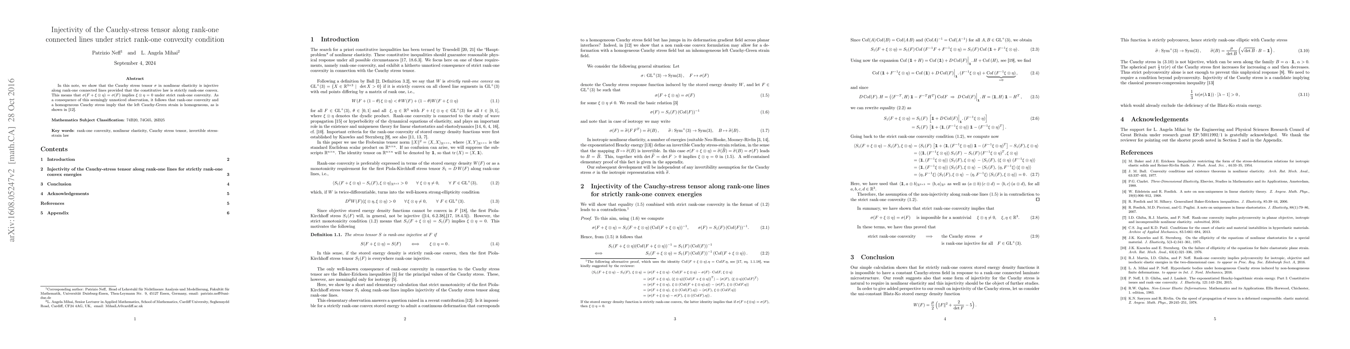 The Cauchy stress tensor is injective along rank-one connected lines under strict rank-one convexity, meaning that small deformations preserve the material's shape.