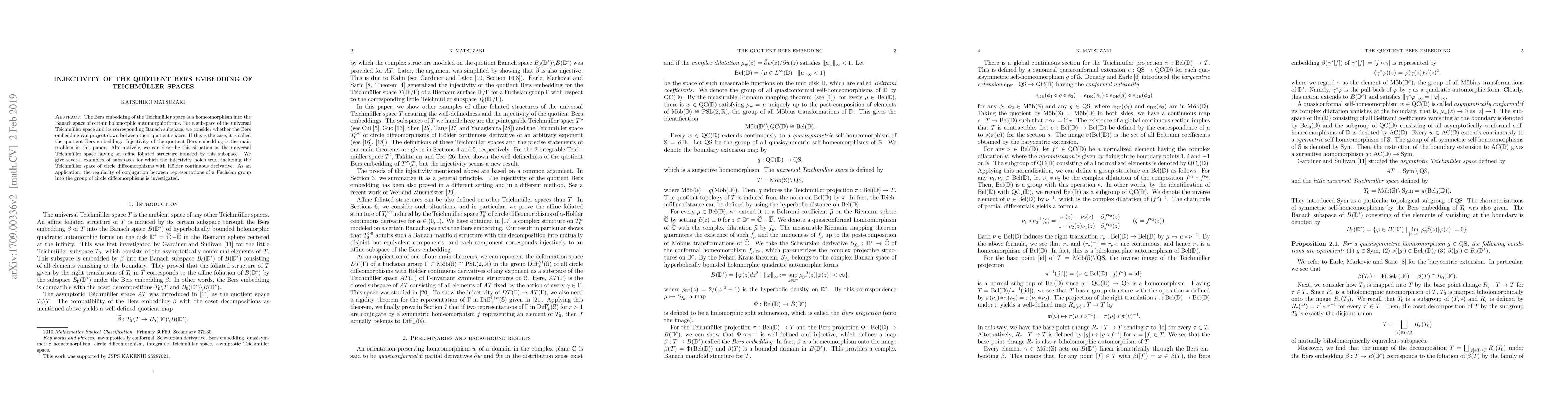 This paper investigates the injectivity of the quotient Bers embedding, which projects between subspaces of the universal Teichmüller space and their corresponding Banach subspaces. The authors provide examples, such as the Teichmüller space of circle diffeomorphisms with H\"older continuous derivatives, where this injectivity holds, and explore its application in studying the regularity of conjugation between Fuchsian group representations.