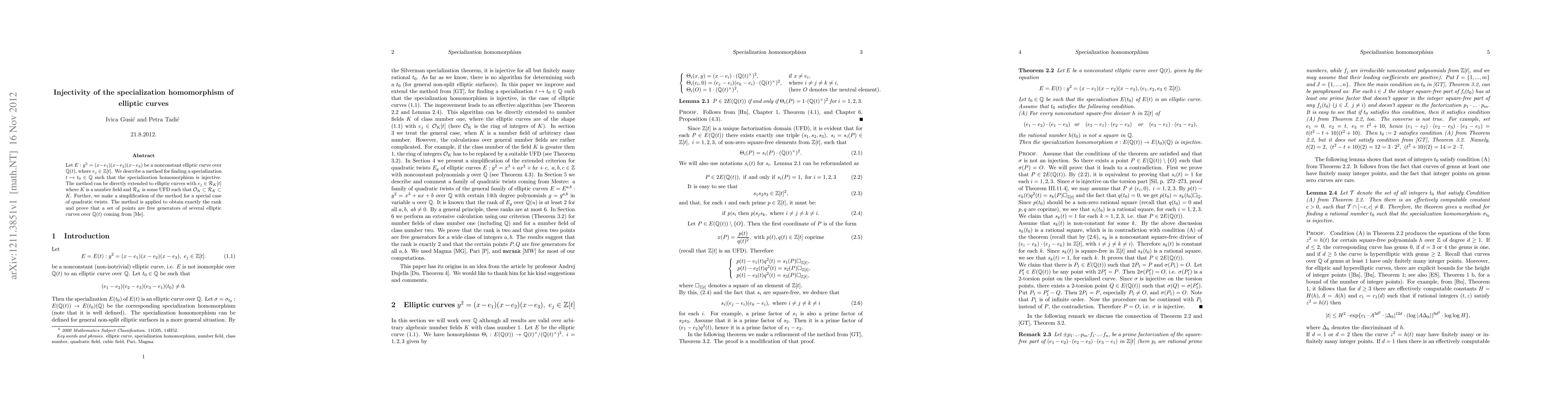Let $E:y^2=(x-e_1)(x-e_2)(x-e_3)$ be a nonconstant elliptic curve over $\mathbb{Q}(t)$, where $e_j\in \mathbb{Z}[t]$. We describe a method for finding a specialization $t\mapsto t_0\in\mathbb{Q}$ such that the specialization homomorphism is injective. The method can be directly extended to elliptic curves with $e_j\in \mathcal{R}_K[t]$ where $K$ is a number field and $\mathcal{R}_K$ is some UFD such that $\mathcal O_K\subset\mathcal R_K\subset K$. Further, we make a simplification of the method for a special case of quadratic twists. The method is applied to obtain exactly the rank and prove that a set of points are free generators of several elliptic curves over $\mathbb Q(t)$ coming from \cite{Me}.